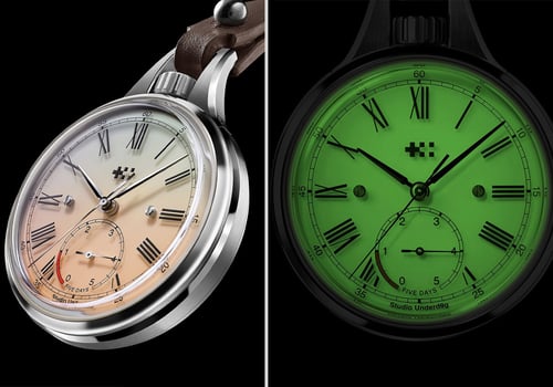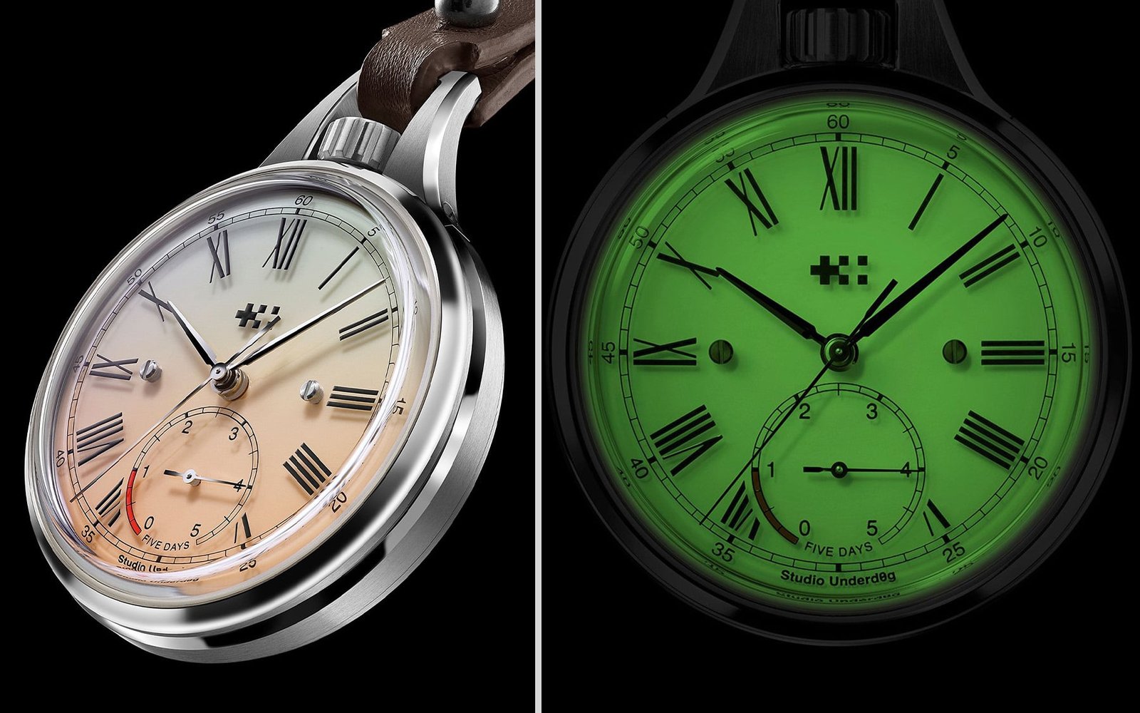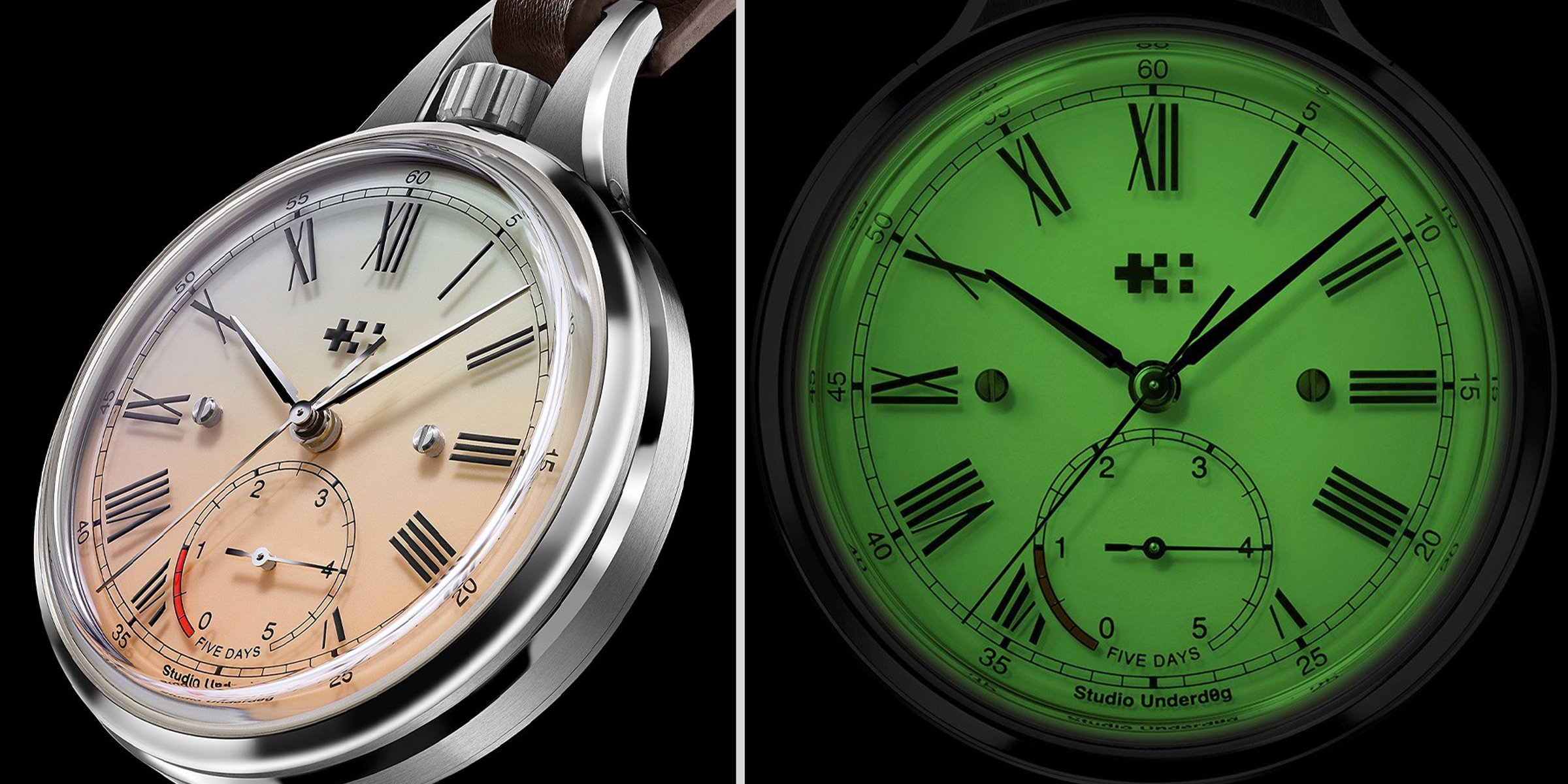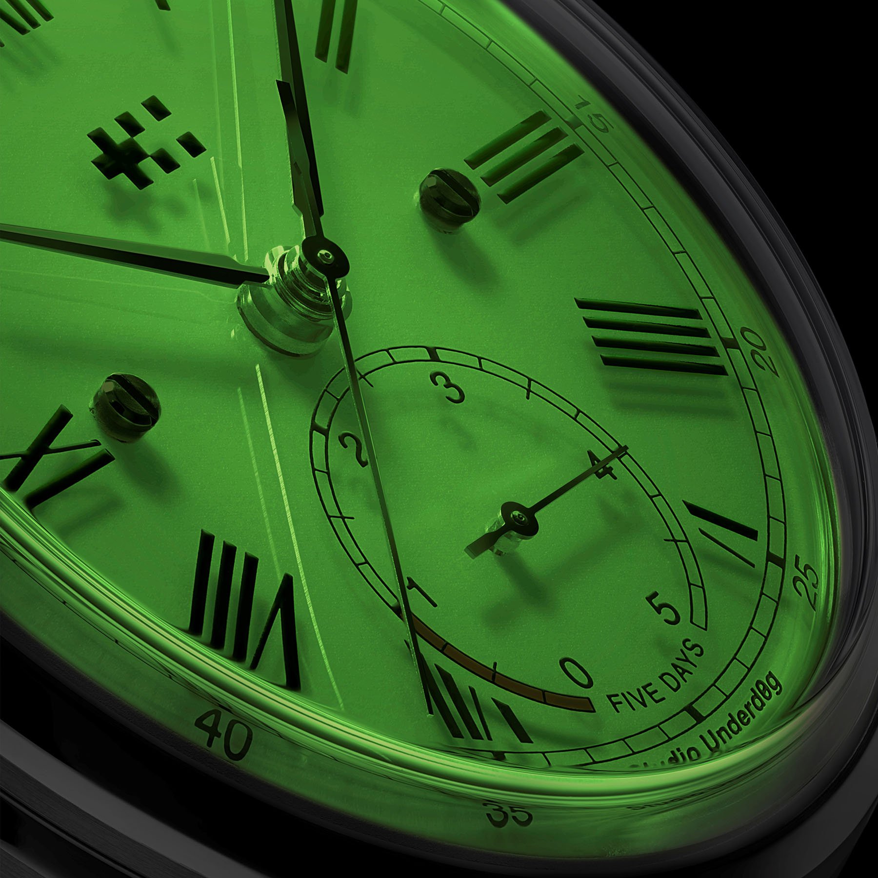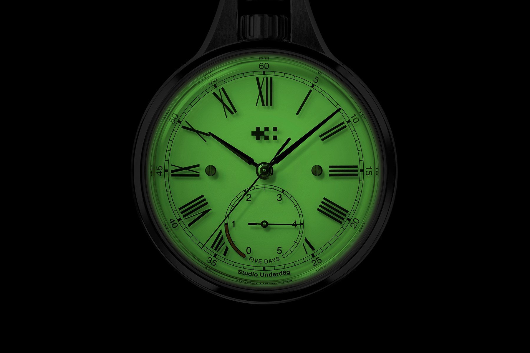 The case is paired with a multi-layered, sandwich dial inspired by the dials of Studio Underd0g’s 02Series, featuring its two characteristic screws. The brass base dial features seven layers of custom-made Super-LumiNova, which makes it light up brightly in the dark. Placed 1.4mm above the dial is a sapphire disc featuring the printed minute track and Roman numerals for the hours.