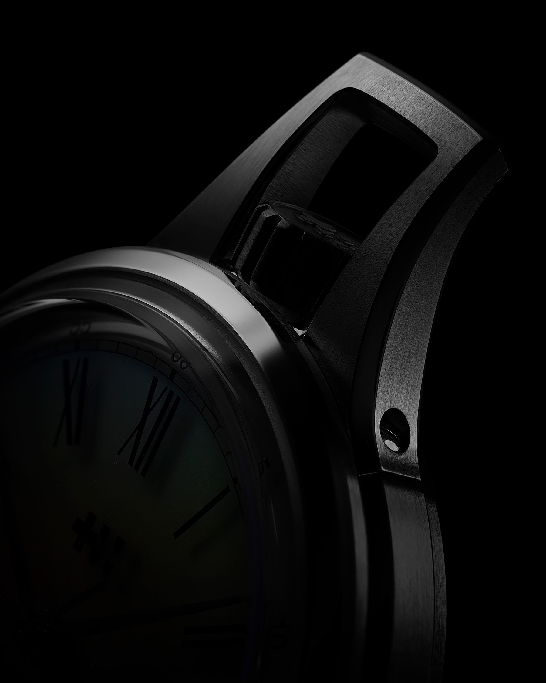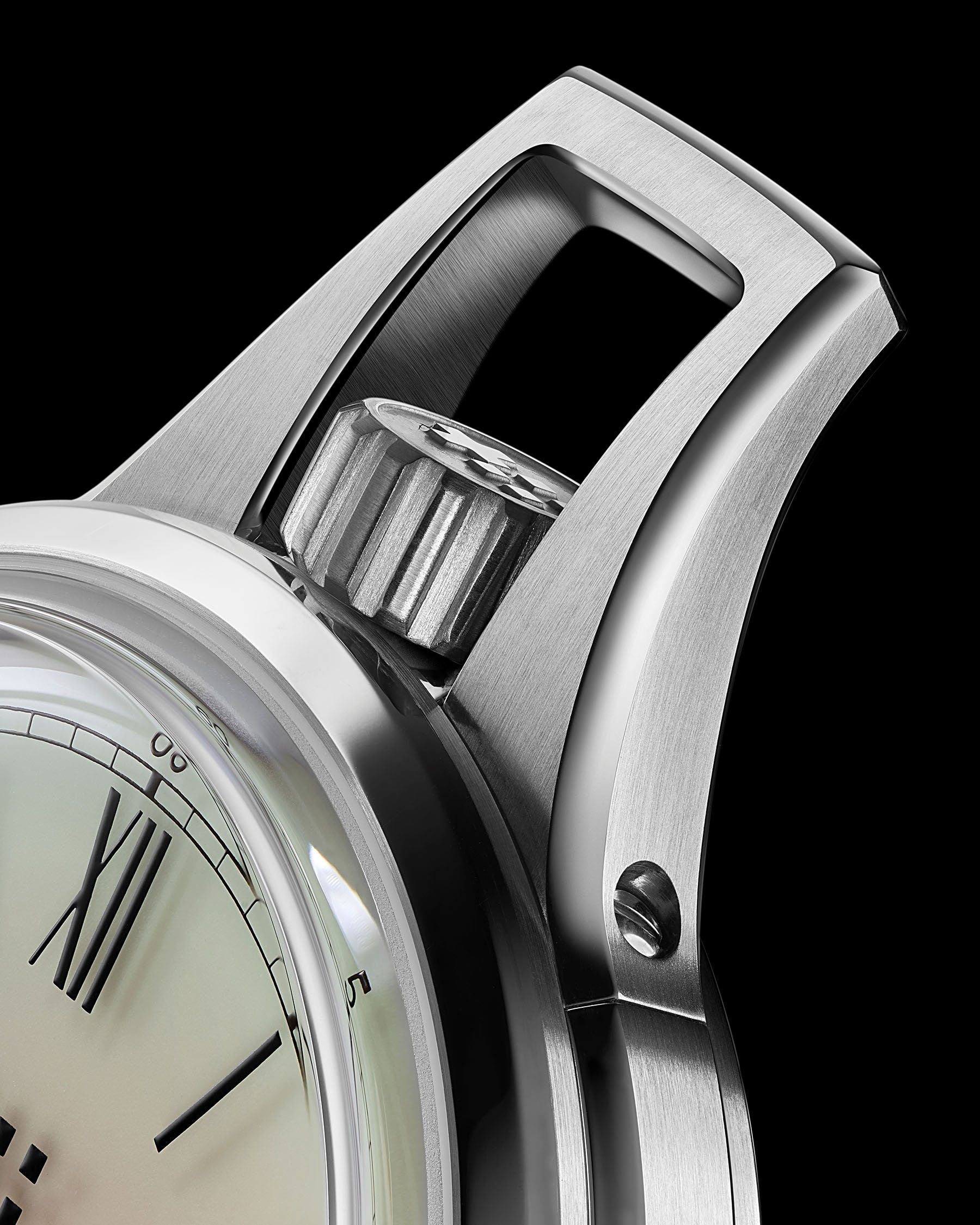 The modern pocket watch case flows really nicely and is beautifully finished. It features a crown at 12 o’clock, and a mix of brushed and polished parts gives it the right visual sparkles to stand out immediately. I especially love the shape and detail of the bow, which also serves as a crown guard. One detail I adore is the way the affixing screw sits flush in the arching base of the bow. It adds a technical detail that perfectly complements the overall style, making for a great modern pocket watch case.