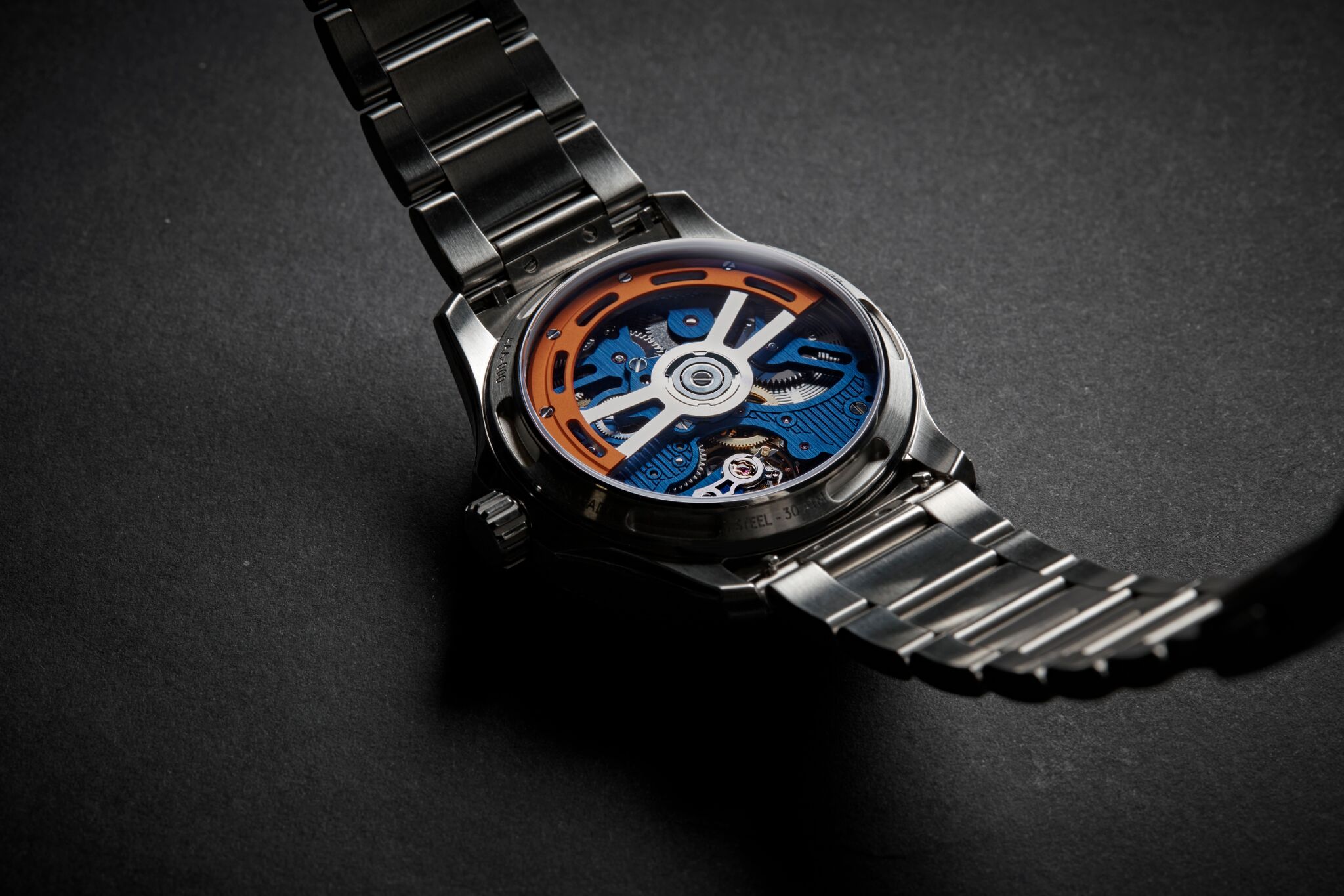 What makes this watch interesting, besides the impressive movement and skeletonisation work in collaboration with Armin Strom, is the attention for details. The decoration of the movement, as well as the tiny details that can be found on the dial side (engraved Ruthenium plate and orange anodised aluminium bridge), makes it a watch worth investigating. The hands are finished using sandblasting and polishing techniques, resulting in very legible hands from any angle.