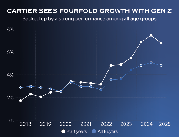 Looking at the Chrono24 data, the trend is astounding: Cartier’s share of total watch sales among Gen Z has increased from 1.7% to 6.8% in a span of seven years – in other words, it has increased more than fourfold. Comparing this to the overall data of all age groups combined, it highlights just how big of a driving force Gen Z is for Cartier: Cartier has “merely” increased by 65% in sales, going from 2.9% to 4.8% across the same timespan.