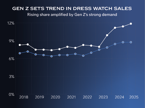If we zoom out further and look at the dress watch category in general, Gen Z remains the trendsetter with the share of dress watch sales increasing by 44% from 2018 to 2025, compared to an average of 29% sales increase among other age groups. 12% of all watches bought today by Gen Z are dress watches, the highest share among all age groups.