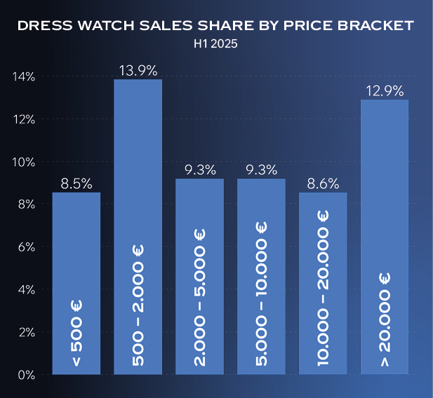 The most intriguing development was the impact Gen Z is having on the dress watch category. However, we already noted a signal that may predict future market direction: While dress watch demand has surged dramatically since 2023, H1 2025 shows the first slight dip in this trend. Whether this represents a temporary pause or a shift in Gen Z‘s interest will be closely monitored in upcoming market analyses.