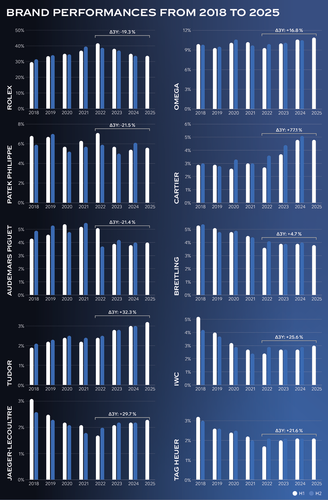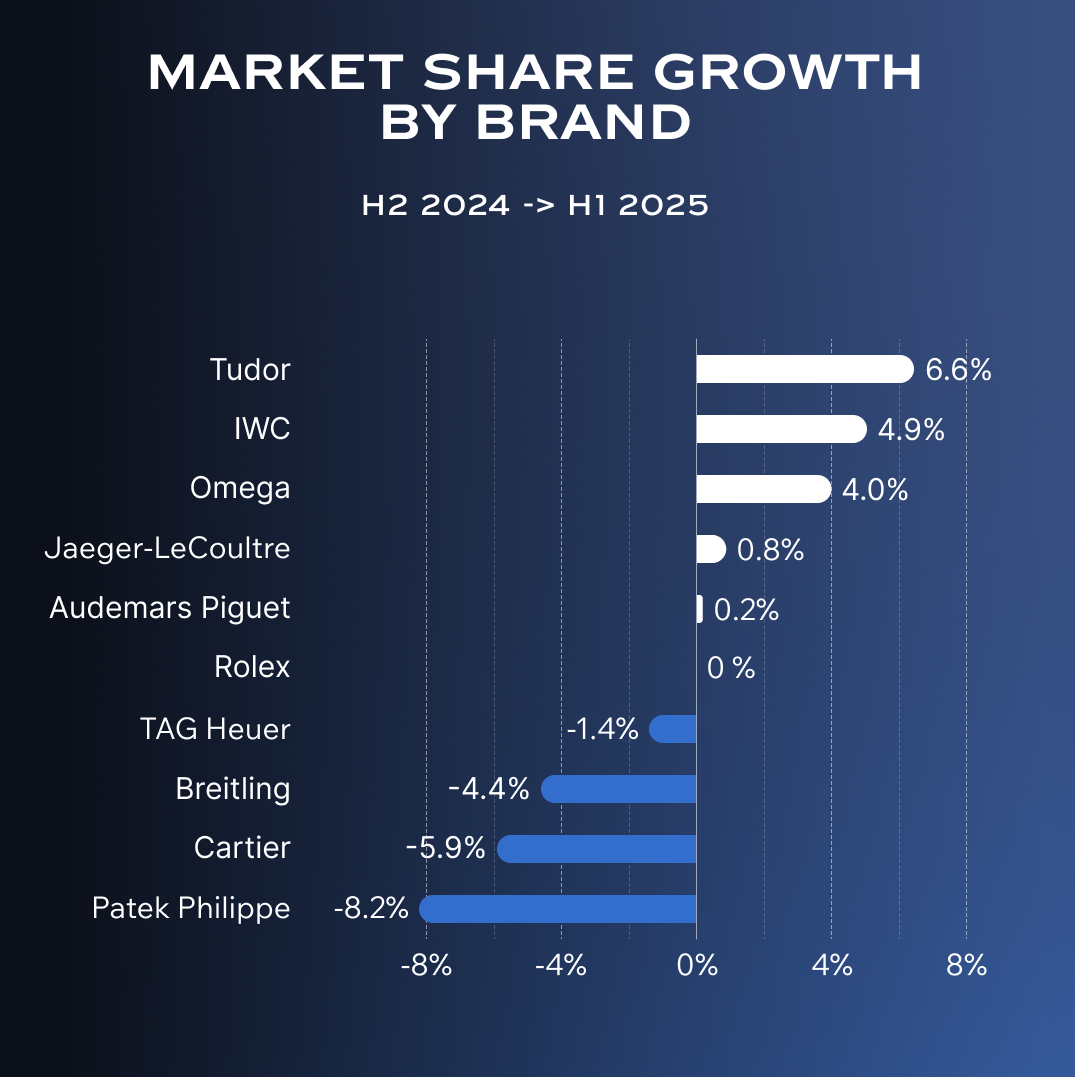 In H1 2025, Rolex continued to show a slight decline in market share, a trend that began in H1 2022. However, the drop has slowed noticeably in recent periods, suggesting the brand is finding an equilibrium. Despite this, Rolex remains the undisputed leader in the watch world, with demand staying exceptionally strong across both new and secondary markets. Many models still have long wait lists at authorized dealers, and allocations for highly sought-after pieces like the stainless-steel Daytona or GMT-Master II “Pepsi” are hard to come by.