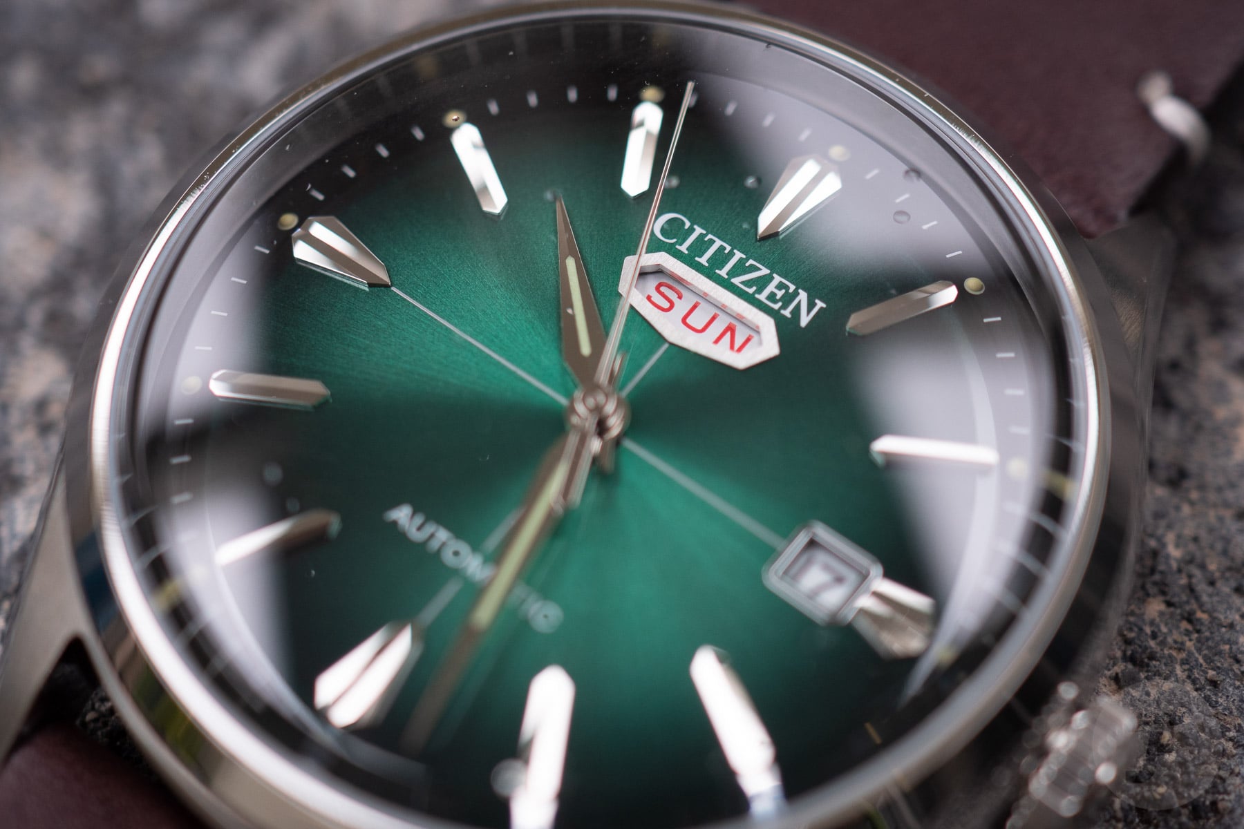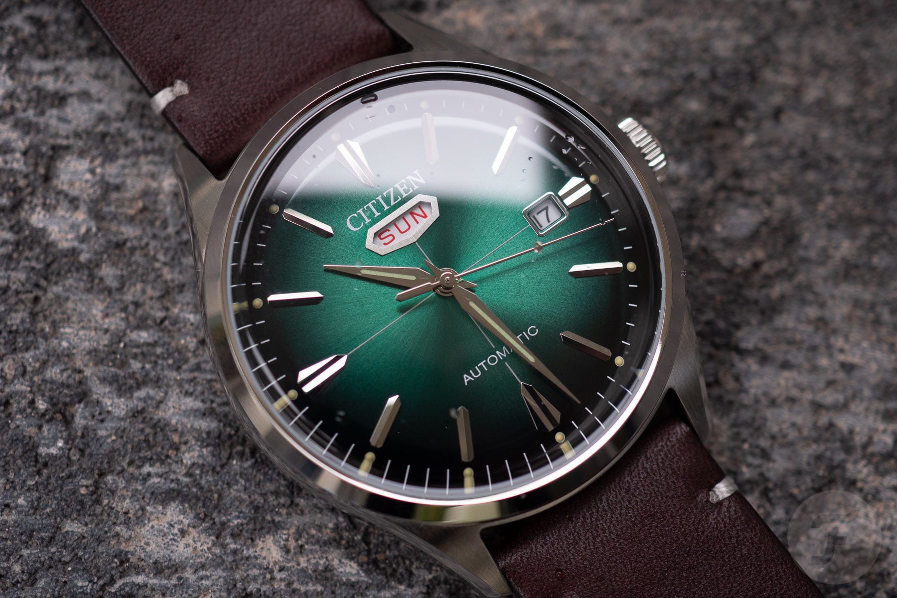 When it comes to the day display, the aperture is located under 12 o’clock. This position was considered unique back then because the standard practice was to put the day next to the date at 3 o’clock. Here, the day window sits below Citizen’s logo with a heptagonal frame to echo the seven weekdays. Interestingly, the applied indexes also take on a heptagonal shape. Like the Crystal Seven watches of the past, the day display of the C7 shows Sunday in red. All other days of the week are printed in black.