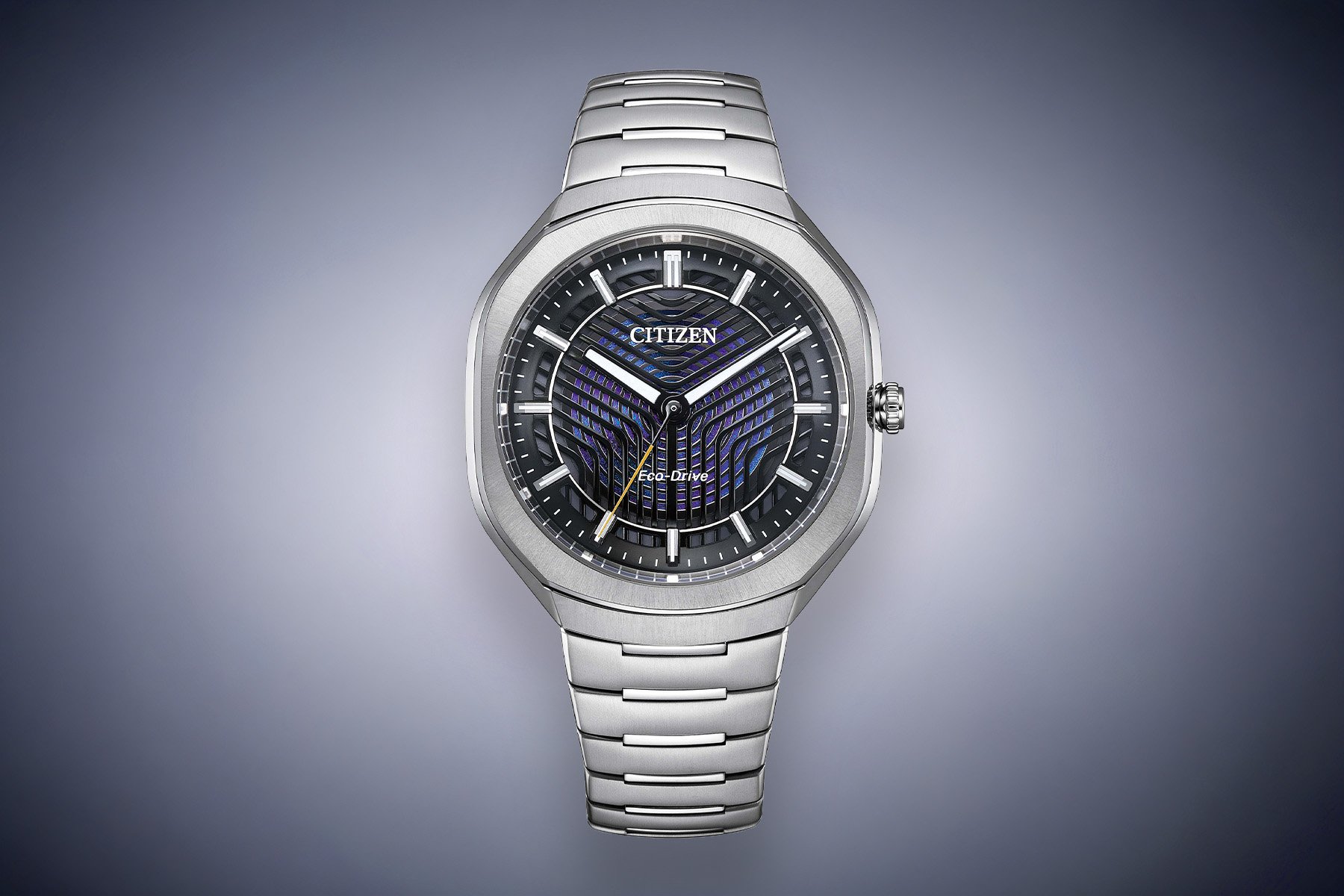 The design of the dials below represents light passing through them, embodying Eco-Drive’s actual function. These dials feature two superimposed metal plates with wave-shaped and circular cutouts. These allow a view of the textured, colored foil beneath, which displays various hues from different angles when light reflects off it.