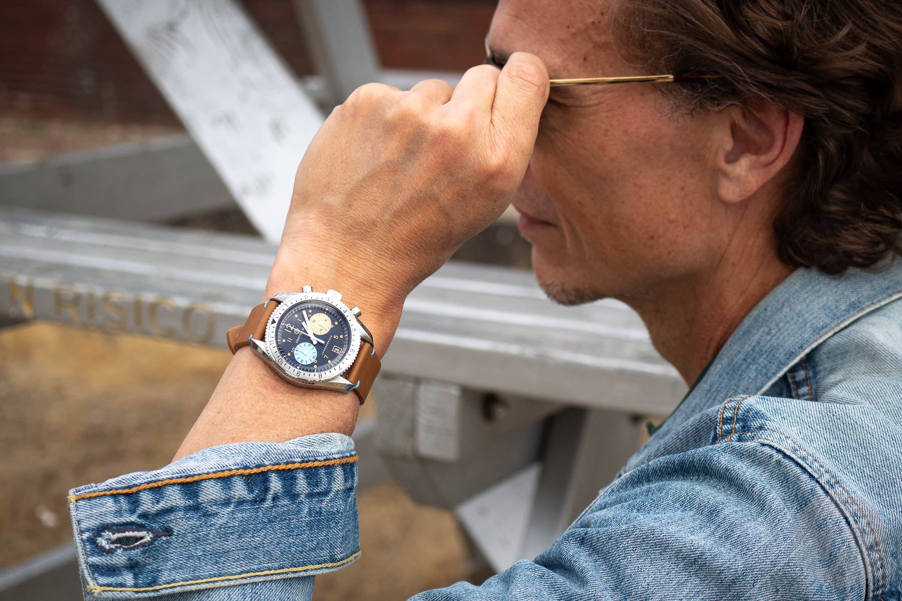The watch also has a domed sapphire crystal over a rugged-textured navy dial showing beige Arabic numerals and markings, white stick hands with Old Radium Super-LumiNova, and a date window at 6 o’clock with a creamy beige outline. A matching beige sub-dial at 3 o’clock is a 24-hour indicator, while the baby blue sub-dial at 9 o’clock counts the chronograph’s elapsed minutes up to an hour. Surrounding all this is a steel bidirectional 12-hour bezel.