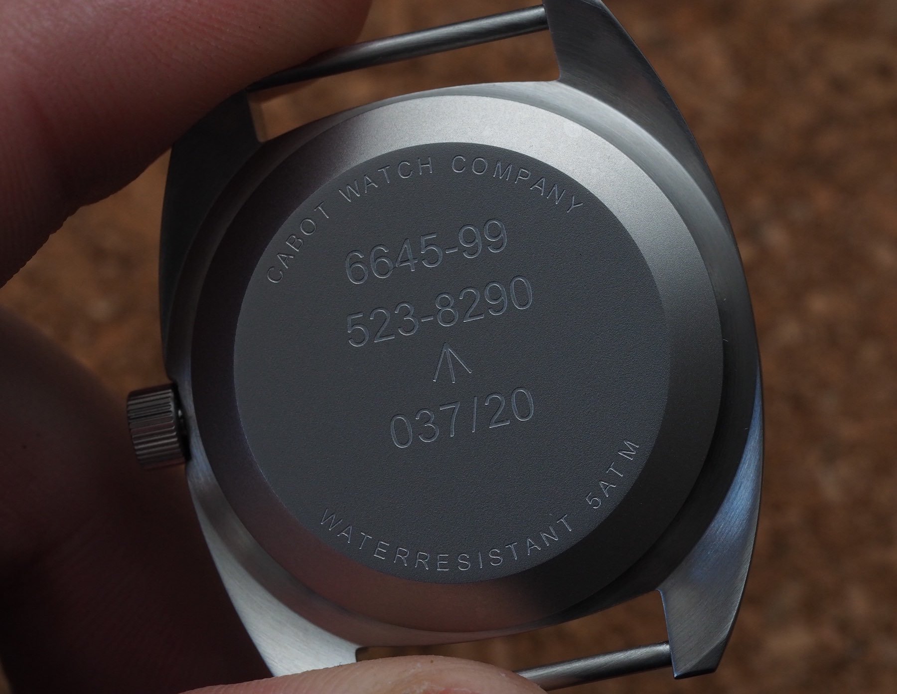 Talking of the originals, it is nice to see their influence still being felt in often-neglected areas like the case back. The engraving here is, again, period-appropriate. On the back, you will find the NATO number, the classic British military broad arrow, and a serial number styled ###/20. What’s really cool about this unlimited edition, is that you can request your serial number. Just drop the people at Cabot Watch Company a line and see what they can do for you. It’s particularly cool if you’re buying this for a loved one’s birthday, or if you (or they) have a lucky number.