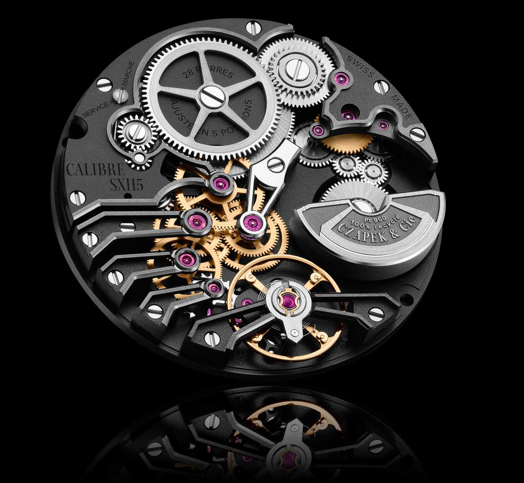 The SXH7 uses the same base architecture as the SXH5 and has similar specifications. Unlike the former movement, though, this watch powers a sub-seconds register. Czapek will produce 50 of the larger model and 25 of the 38.5mm edition annually. Pricing is slightly elevated at CHF 42,000.