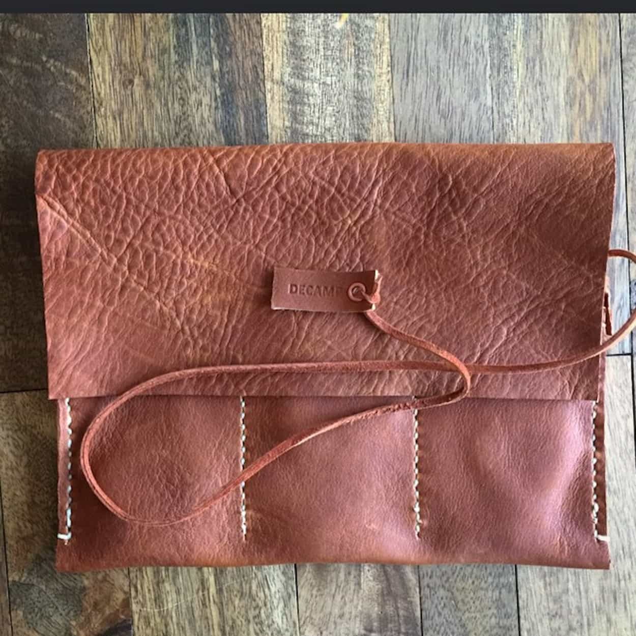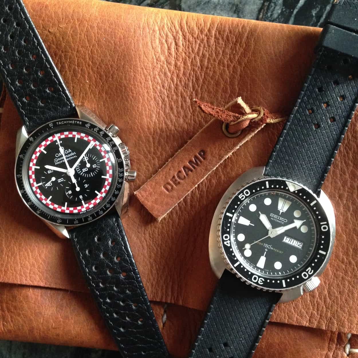 A friend asked if I knew of anywhere online where he could find something to store his watch in while he was at the gym. I didn’t have an answer, but I researched online and found that there wasn’t much, and what there was expensive. I’m fortunate to work for a shoe and apparel company where there are fabric and leather swatches that get tossed out from time to time. Over a weekend I decided to tinker with a few swatches and slowly the design came together – a design I must say originally inspired by an image on Instagram by @btint. I posted these original pieces on Instagram (@ethokin) and got a lot of encouragement from followers. I gifted those first pieces as they were pretty amateur, but as I got better I created the @decamp_goods IG page with the purpose of actually selling them. I sold the first batch quickly and since then it has evolved into a custom business where the customer decides the size, color and leather type. I make these out of a passion for watches and desire to create something for people that should last their lifetime at a fair price. I personally measure, cut, hole punch and stitch every single one of my products. My wife, from time to time, is recruited for sewing if someone requests the pockets to be a fabric instead of leather, though.