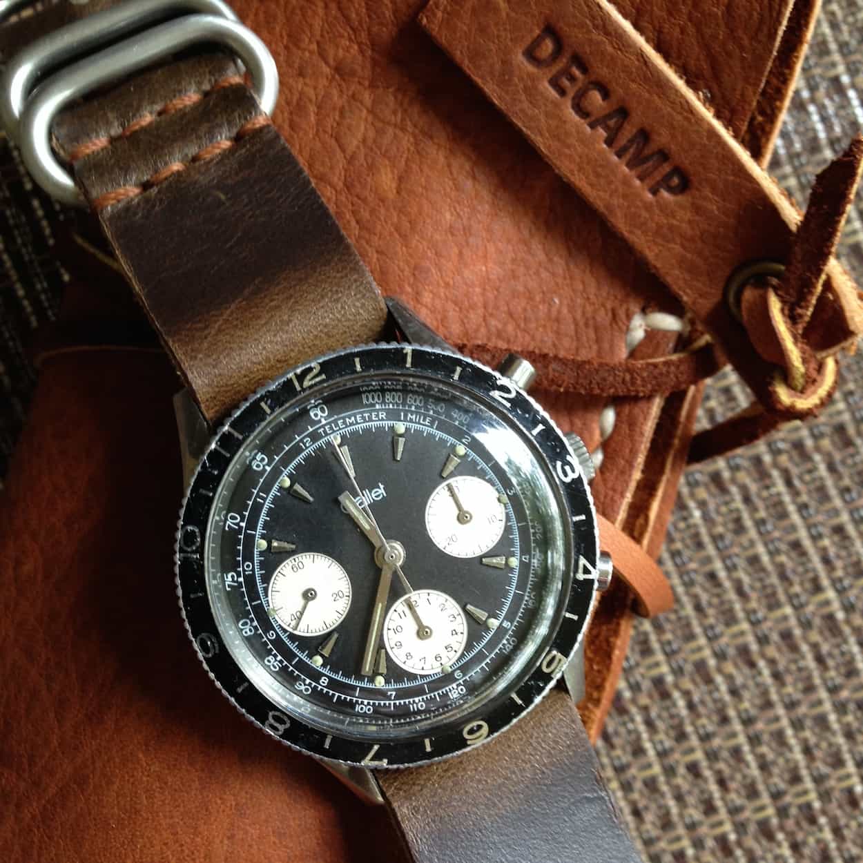DECAMP is all about watch rolls for the collector, of late I’ve also started creating some wallets too. I had been thinking long and hard about a name that would evoke an emotion instead of something eponymous. I was out to dinner one night and gazing out the window when I saw a sign for a shop called “the camp”. “DECAMP” popped into my head almost immediately. I had a vague understanding of the word so I googled it and one part of the definition is “to leave suddenly”, which was perfect: watch rolls for the collector who has to go on a trip with short notice and can take multiple pieces with him/her. The triangular DECAMP logo was inspired by the tip of a GMT hand, which brings to mind travel as well. Whether the trip is for fun or an arduous business trip, taking along a few watches can only make it better. Also the ceremony of unraveling the watch roll to select a watch for the day is more refined than pulling a watch out of a balled up sock.
