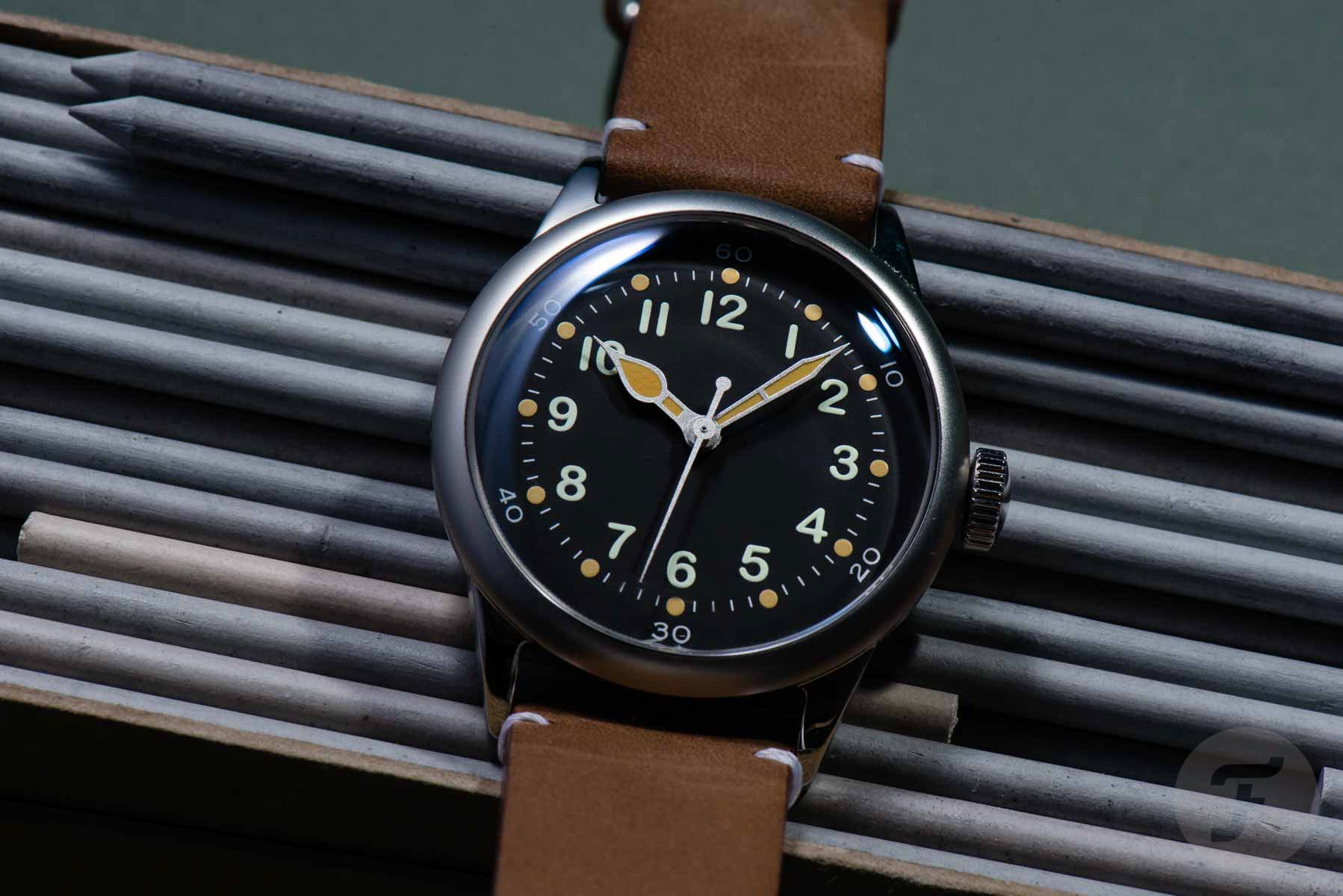A-11 wristwatches were manufactured during WWII according to a U.S. military standard. American watch companies like Elgin, Waltham, and Bulova produced these watches. Most of them had white hands and Arabic numerals, as well as 60-minute graduations on their plain black dials. They were housed in, by today’s standards, small 32mm chrome-plated brass cases, and it’s believed that at least 150.000 were made. There were so many produced that an original vintage A-11 can still be found for a few hundred dollars.