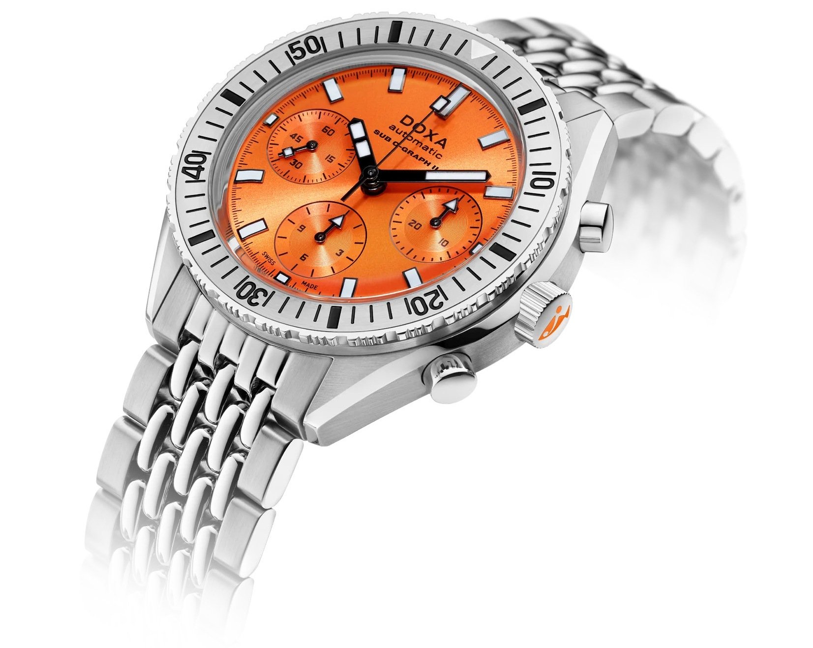 However, its charm was not in its size but rather in the complication inside. As its name suggests, the Doxa Sub 200 C-Graph was a chronograph version with three sub-dials and no date. Inside the 2020 model beat the 27-jewel Sellita SW510 with a 56-hour power reserve and a 28,800vph frequency. The watch was a beautiful expansion of the model line but not something that spoke to many thanks to its significant size. What sweetened the deal for some was that, like most Doxa models, the C-Graph came in six colors (orange, black, silver, blue, yellow, and aquamarine) on a beads-of-rice bracelet or an FKM rubber strap. Consequently, the 2020 Doxa C-Graph was a highly versatile timepiece.