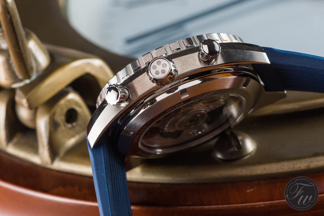 As you can see on the picture below, the pushers aren’t screw-down and the winding/setting crown has the 5 ball bearing Eterna logo. The watch is water resistant up to 20Bar (~200 meters). Now, someone made a comment on our Instagram account on this watch (we already published a wrist shot of this watch there) that a diver’s chronograph with no screw-down pushers is a bit odd. I agree, although the Seamaster 300M Chronograph also doesn’t have screw-down pushers (and can be operated under water). The winding and setting crown is screw-down, of course.