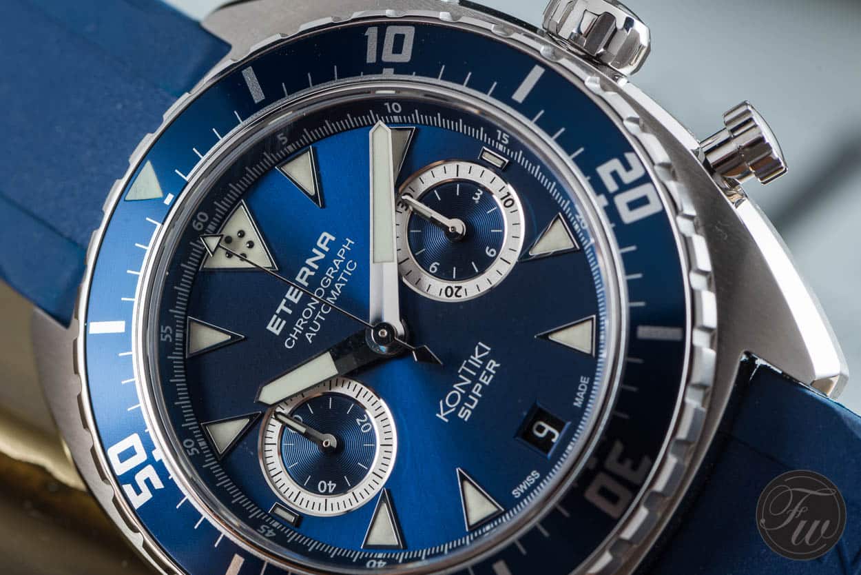 I like the sunburst dial on this blue version of the Eterna Super KonTiki Chronograph. The black version has a matte dial, which is perhaps a bit more ‘tool-watch’ proof. However, this watch is a great piece to wear on land as well, during Summer. So the sunburst will give that nice effect on the dial. The triangular hour markers are filled with Super-LumiNova and perform very well. All hands, including those on the sub dials are lumed up.