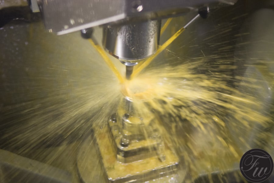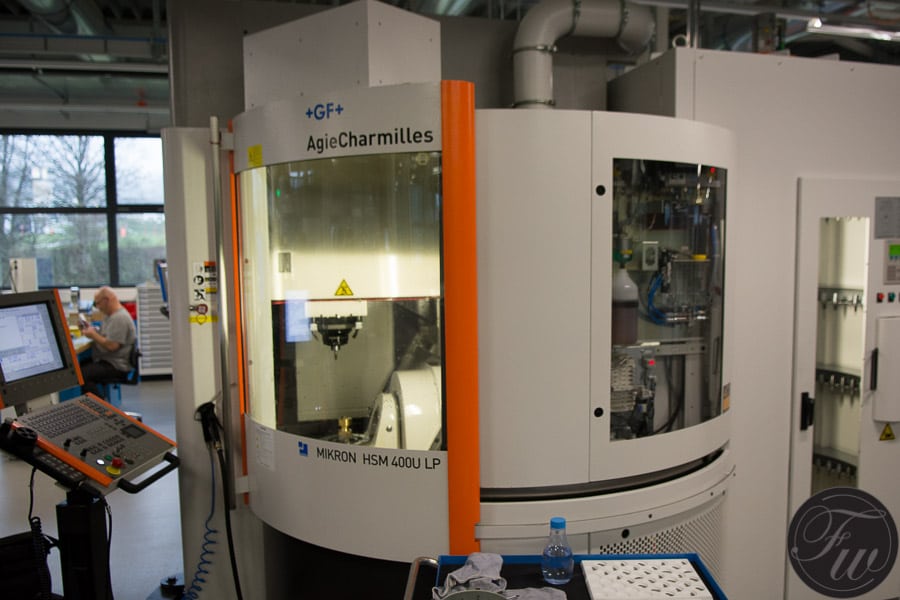 This company, called the Pro Art Factory, is the production facility for Richard Mille. A modern building with a floor filled with high-tech equipment. These CNC machines are used for cutting and drilling the materials used by RM such as carbon fiber, titanium, composite materials et cetera. Both for the cases as certain movement parts.