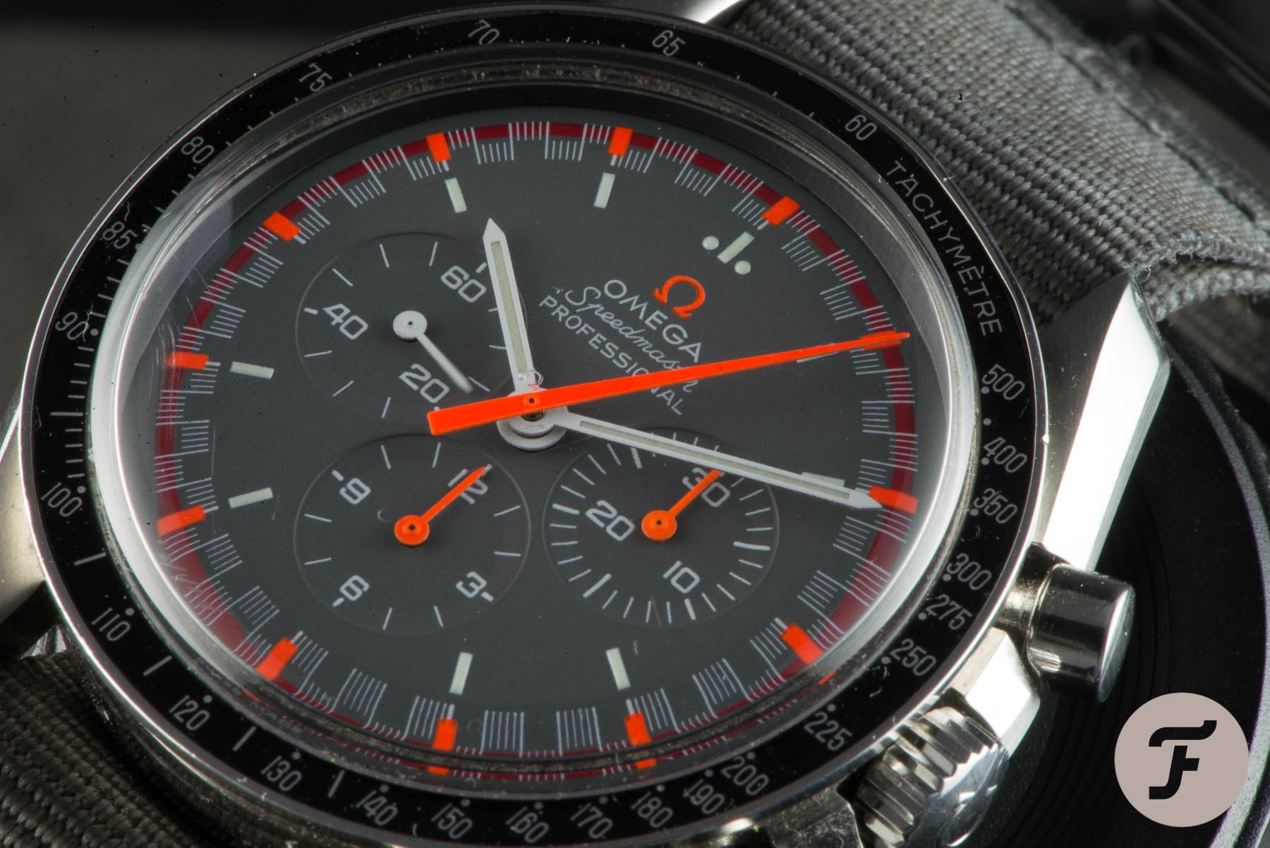 Despite the use of Sedna gold, this Speedmaster Apollo XI still has a tool watch look & feel to it. It came on this brown NATO strap, but you can also fit the titanium Speedmaster bracelet from the X-33. The retail price of this watch was around the €6,000 mark and nowadays, they go for well over €10,000.