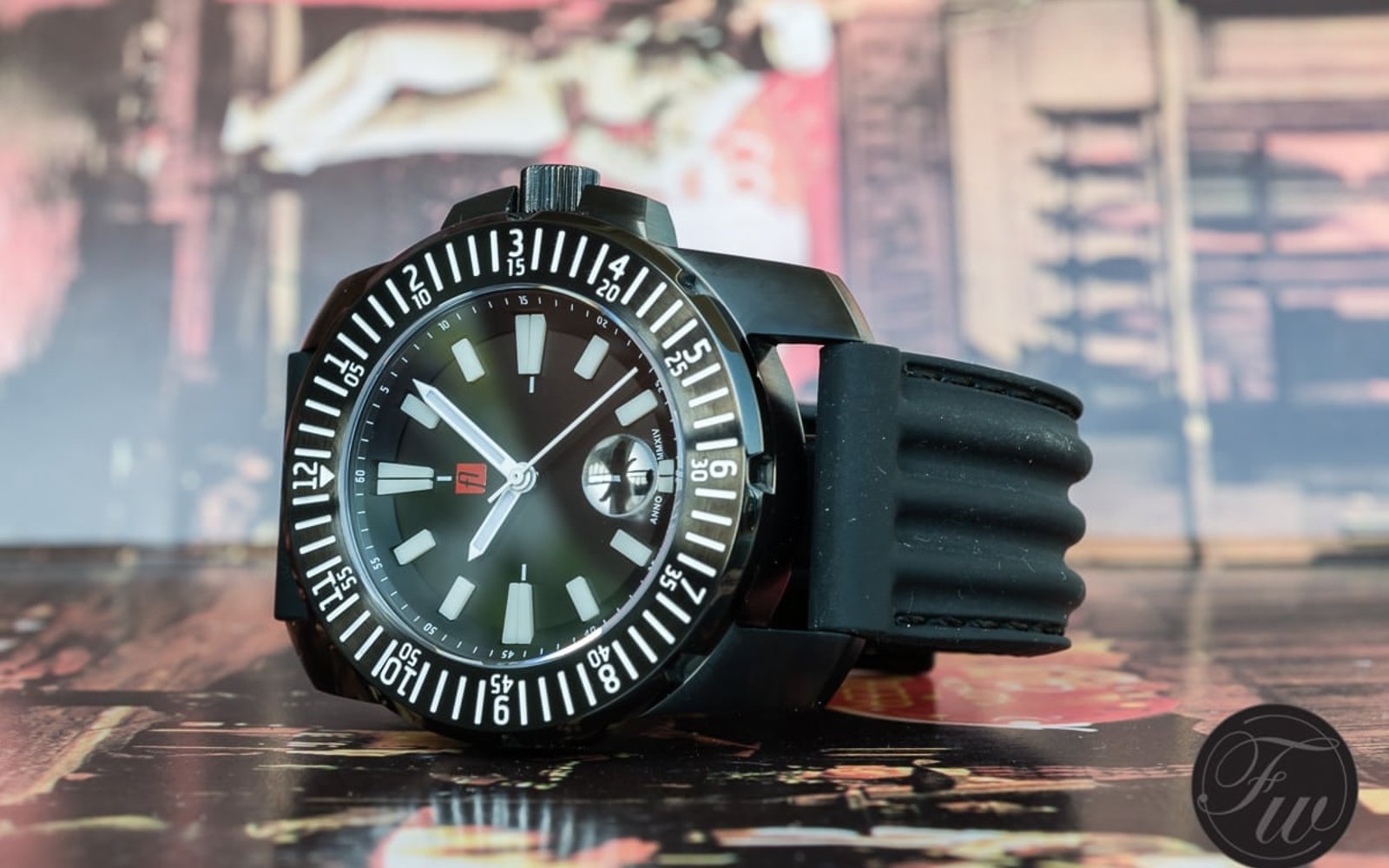 On first sight the Florijn F03 is a very present watch. Not surprising. The casing measures 45 mm in diameter while being over 14 mm in height. This, combined with a lug width of 24 mm, the Florijn 03 shows as a large watch. And then the bold lines in the tuna can-ish cylindrical design of the watch head, add up to the robust appearance of the watch as well.