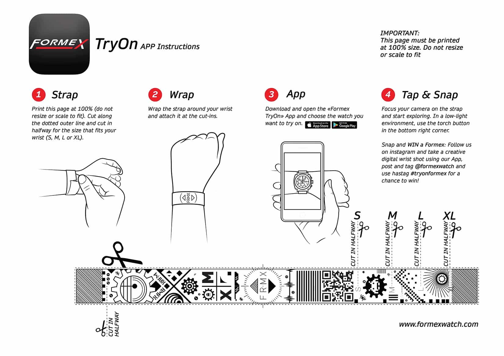 Here is how it works: print and cut out the paper strap, wrap and attach it around your wrist and install the „Formex TryOn“ App on your smartphone. Then open the App, choose the watch you want to try on and focus your camera on the strap. A surprisingly realistic looking virtual version of the watch will appear on your smartphone screen. Turn your wrist gently and observe the watch from different angles and distances on your wrist. In case you are using the App in a low-light environment, use the torch button for better recognition. Print out the App Instructions and Strap here.