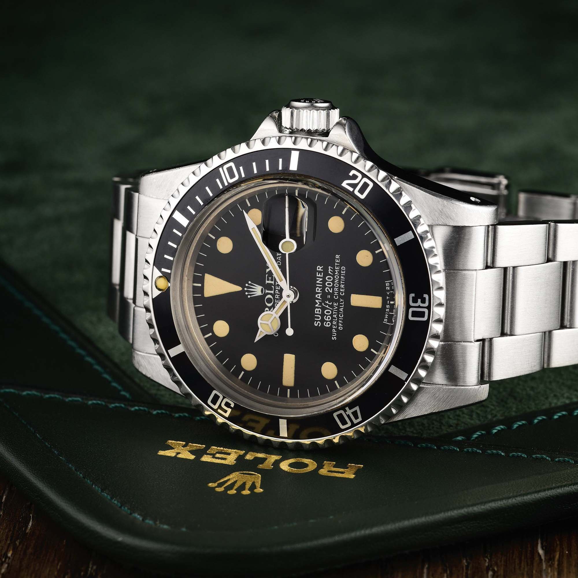 A watch that needs no further introduction (and if it does, click here for our historical overview of the Rolex Submariner). This reference 1680 was introduced in 1966 and was the first Submariner to have a date feature. The early versions had the word ‘Submariner’ printed in red, until 1973. The watch that is being offered though, was produced in 1978.