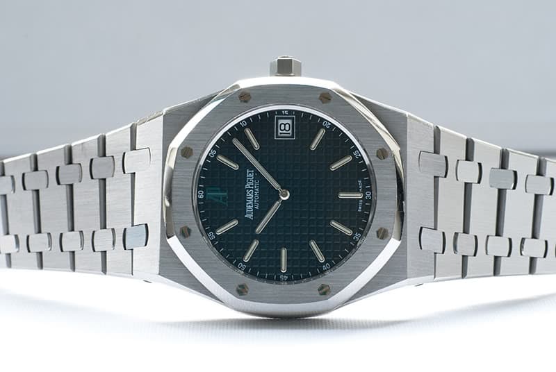 Nowadays often confused with the Royal Oak Date ref.15300ST (which is a bit thicker and has the second hand), the ‘Jumbo’ ref.15202ST is the Royal Oak discussed here. This 39mm diameter watch has a 8mm thick case and measures 49mm from lug to lug. Although measured a bit differently from the Patek Philippe Nautilus, one could say the Royal Oak is a tad bit smaller according to its specifications.
