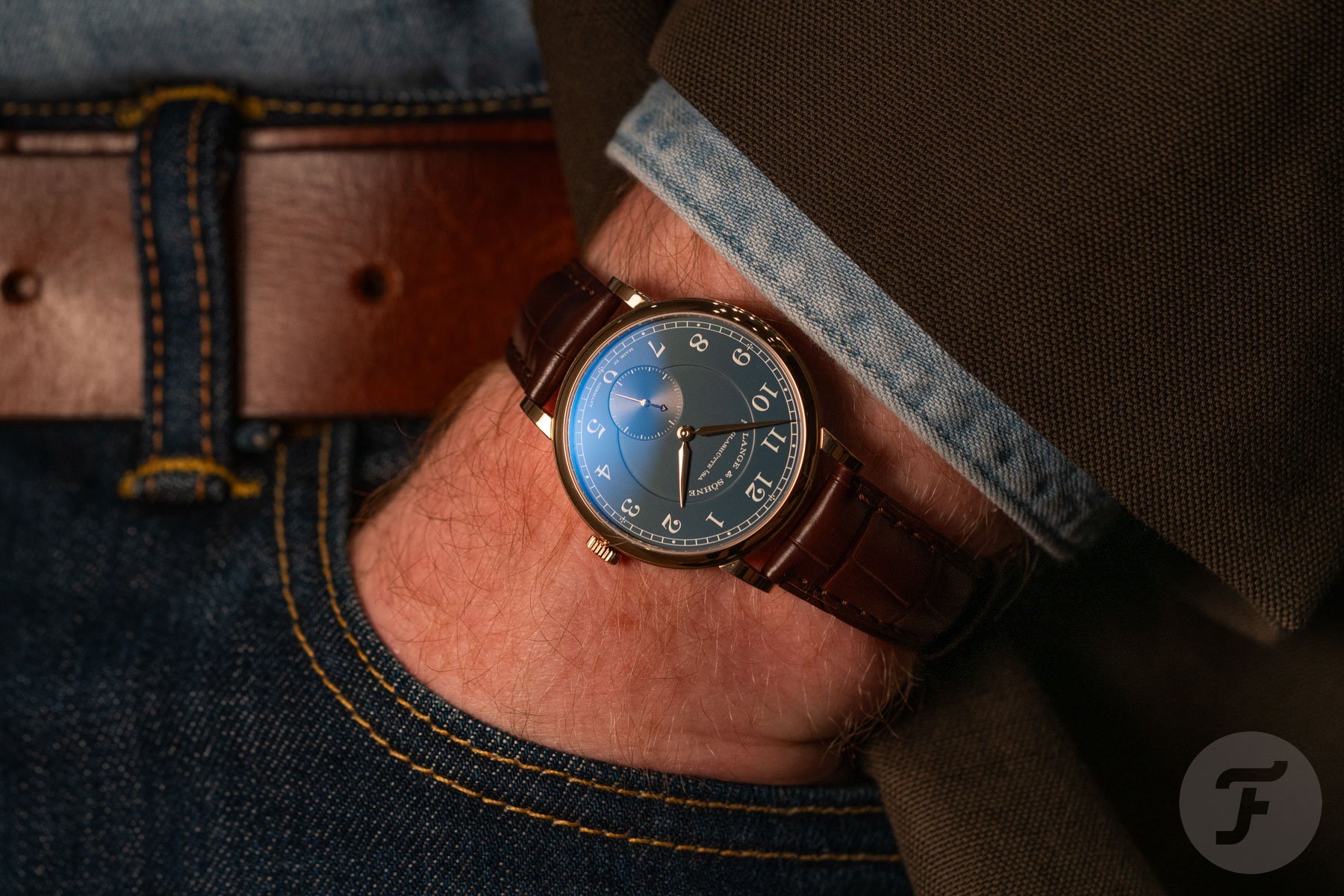 Don’t get me wrong; the A. Lange & Söhne 1815 is right up my alley, especially in its 34mm size. My Breguet Classique 5907 is similarly sized, and on my 17cm wrist, it wears like a charm. With a 6.4mm profile, the Lange is even more than a millimeter thinner than my Breguet. That’s truly impressive, just like the finishing on the movement that you can behold through the case back’s sapphire display. So yes, it’s the perfect size, and I even like the dark blue dial and the large numerals.