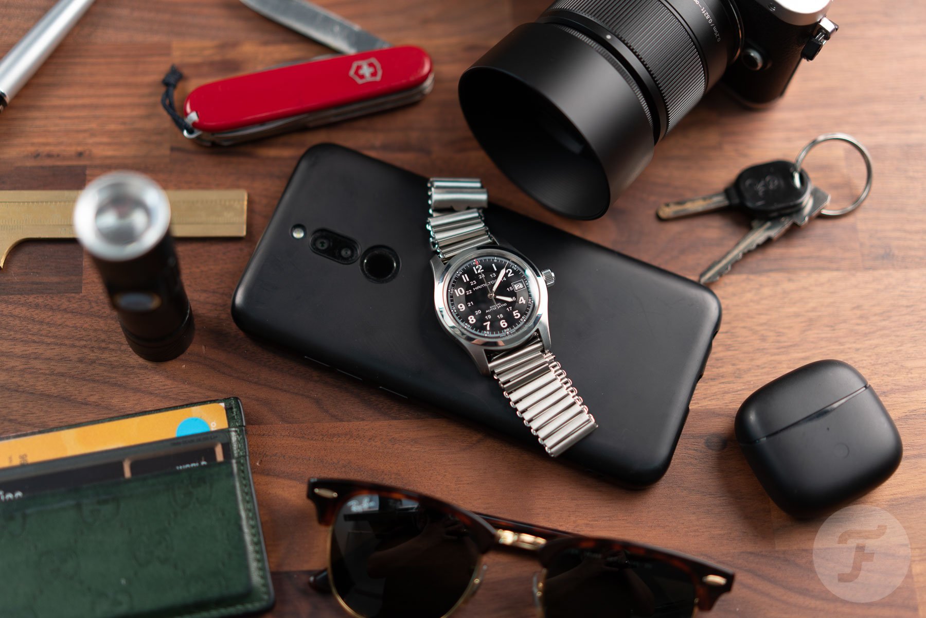 Now, I’ve mentioned most of my EDC already, whether directly or in passing. Other than my bag, camera, laptop, and phone, there are plenty of smaller accessories that I always have with me. Some are pretty banal, such as my house keys or my green Gucci card-holder-style wallet (another secondhand purchase with longevity in mind). But others are rather useful in my daily workflow and perhaps not as obvious. I’m talking about things like the small USB-rechargeable UV torch that I carry with me for activating the lume on watches (there’s no better way to take a lume shot). There’s also a small brass caliper for measuring watches accurately. Then there’s my Swiss Army knife. This is never actually on my person and lives on top of my desk, but it’s used almost every day for opening packages and the like.