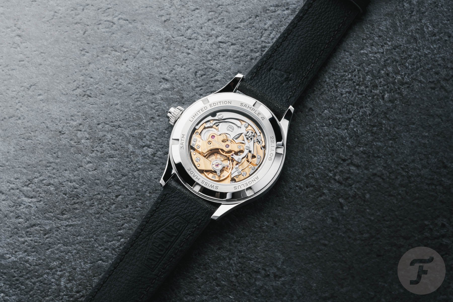 The Chronographe Télémètre Steel Rose has absolutely perfect proportions, with a 37mm diameter, a 44mm lug-to-lug, and a 9.25mm profile. That’s unheard of in the world of ébauche-caliber chronographs. This one, however, uses a modified La Joux-Perret 5000-4. This monopusher chronograph caliber gives this Angelus model its distinct cross-eyed look, which I love. The movement is also a bit of a looker, providing the owner a magnificent view through the sapphire display in the case back.