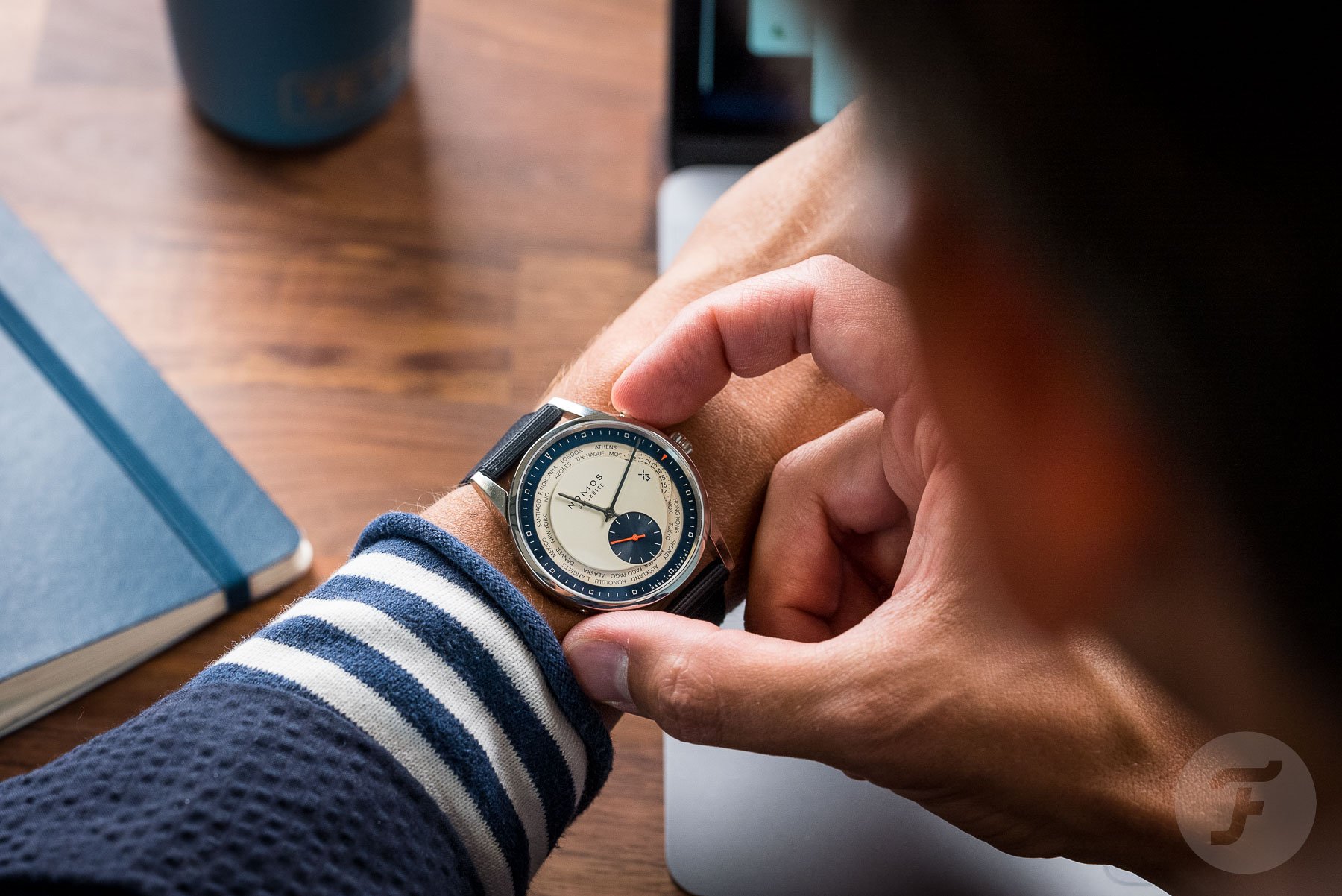 And with that said, the stainless steel case measures 49.4mm lug to lug, 39.9mm wide, and 10.9mm tall. On the surround of the case back, it has an engraving with the watch’s limitation number (x/100) and an inscription of “The Hague Blue For Fratello”. The lugs sit 20mm apart and hold the new navy-blue woven strap for the “Blue Panda” model. This is the first time that NOMOS has paired a Weltzeit with a fabric strap. I believe it makes the watch even more versatile for business and casual settings and keeps it comfortable on the wrist while traveling through time zones.