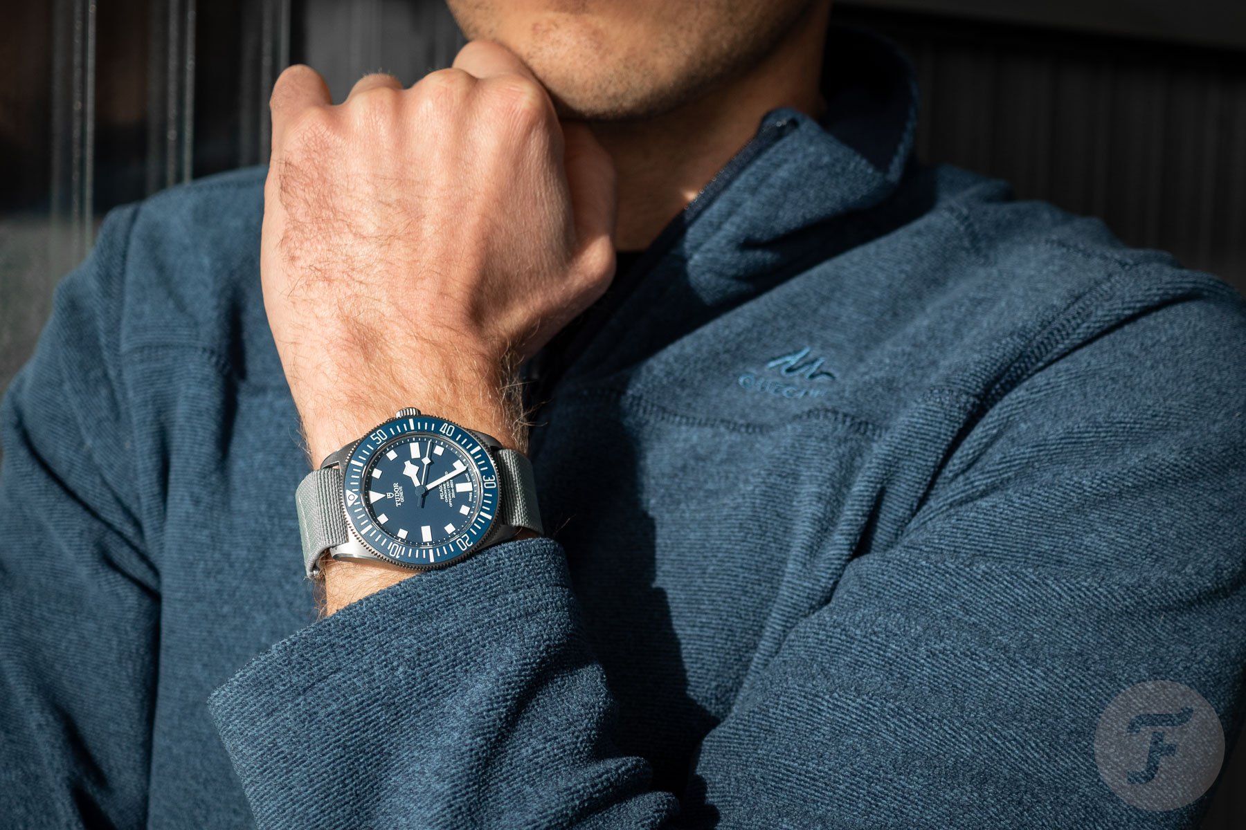 Up first is Morgan, who is wearing a rather different blue diver from the last time he was on the podcast. As his Omega Seamaster is currently off for some TLC, it’s the Tudor Pelagos that makes its way back on his wrist. You may have noticed that it’s not the OEM strap that he’s using to fasten it to his wrist. Today, he has opted for an Erika’s Originals MN strap in gray with a light gray stripe. It’s a classy and comfortable choice for this fan-favorite titanium diver.