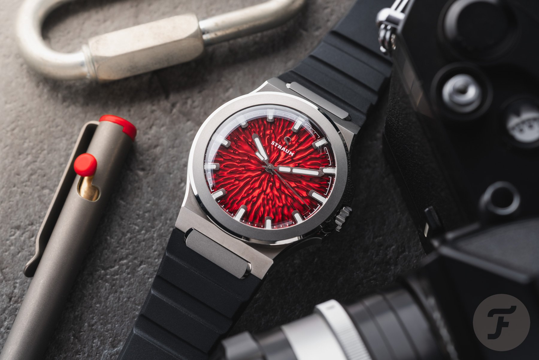 Last up is Nacho, who is wearing the new Fratello × Straum Jan Mayen Titanium. It features an improved version of the dial, with a subtly sharper and more pronounced texture and the same bright red color. However, as you can see, the new titanium case is a game changer. Its matte texture highlights the polished accents and matches the newly engineered rubber strap. We could not be happier with this one!