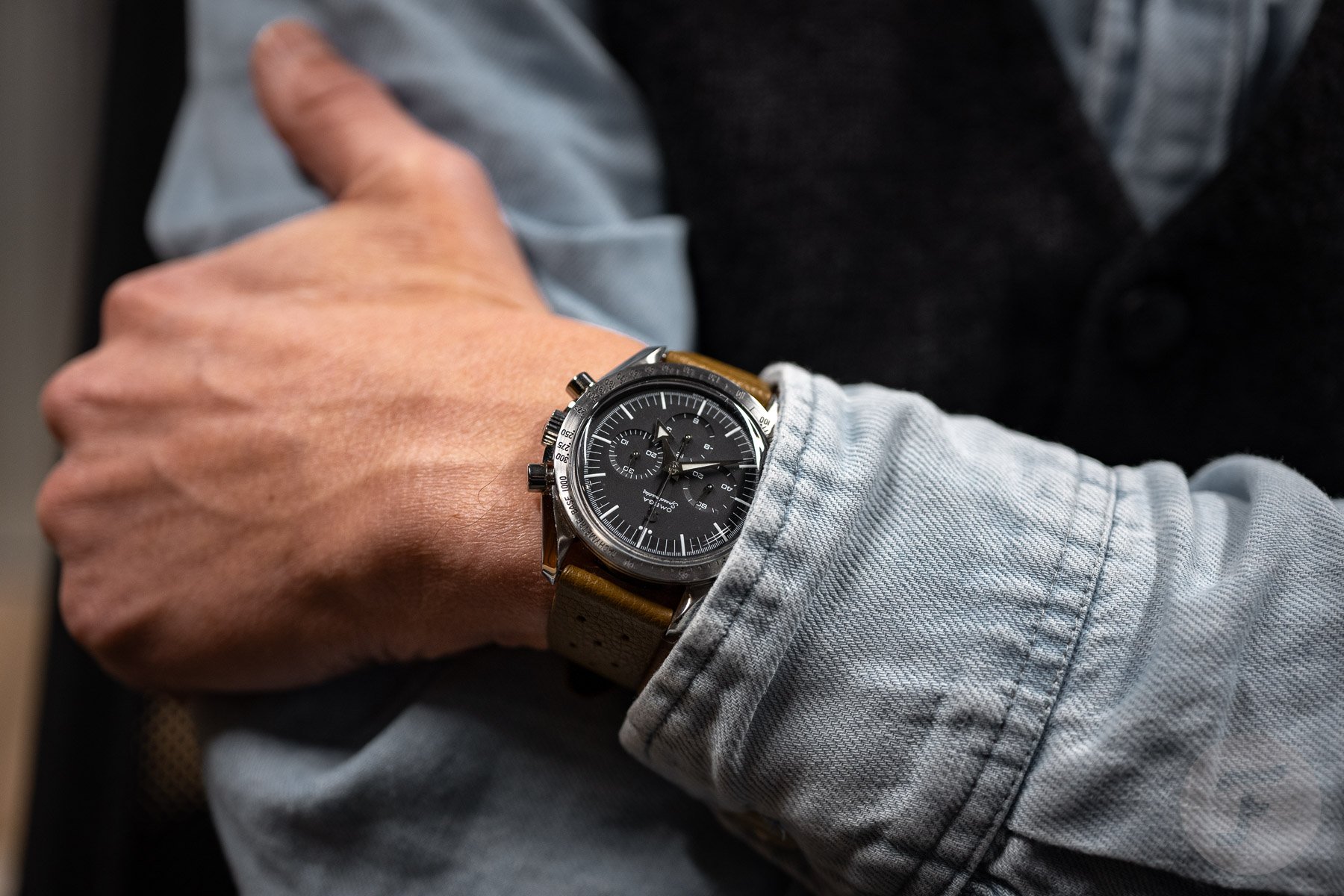 Lex has gone for something in steel. Today, he’s wearing his Omega Speedmaster. This is reference 3594.50, which features Broad Arrow hands and a steel bezel. He’s currently strapping it on with a perforated pigskin strap from Joseph Bonnie.