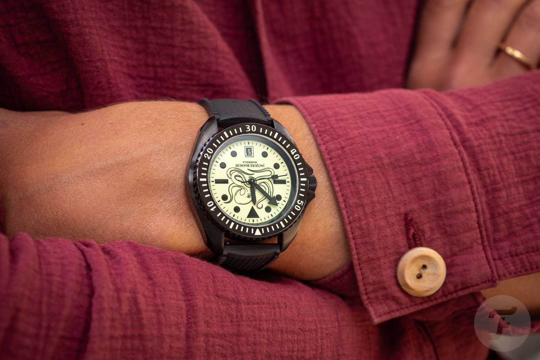Speaking of Fratello limited editions, Daan is wearing our latest, the Jacques Bianchi × Fratello JB200 PoulPro Night Diver. This black PVD-coated, full-lume-dial dive watch is perfect for lighting up late summer nights. Whether you’re spending them by the campfire, on the dive boat, or out on the town at your favorite bar or club, it’s a timepiece for any occasion. We’re very proud of this one, and it seems you were fans as it sold out quickly after its release a few weeks ago.