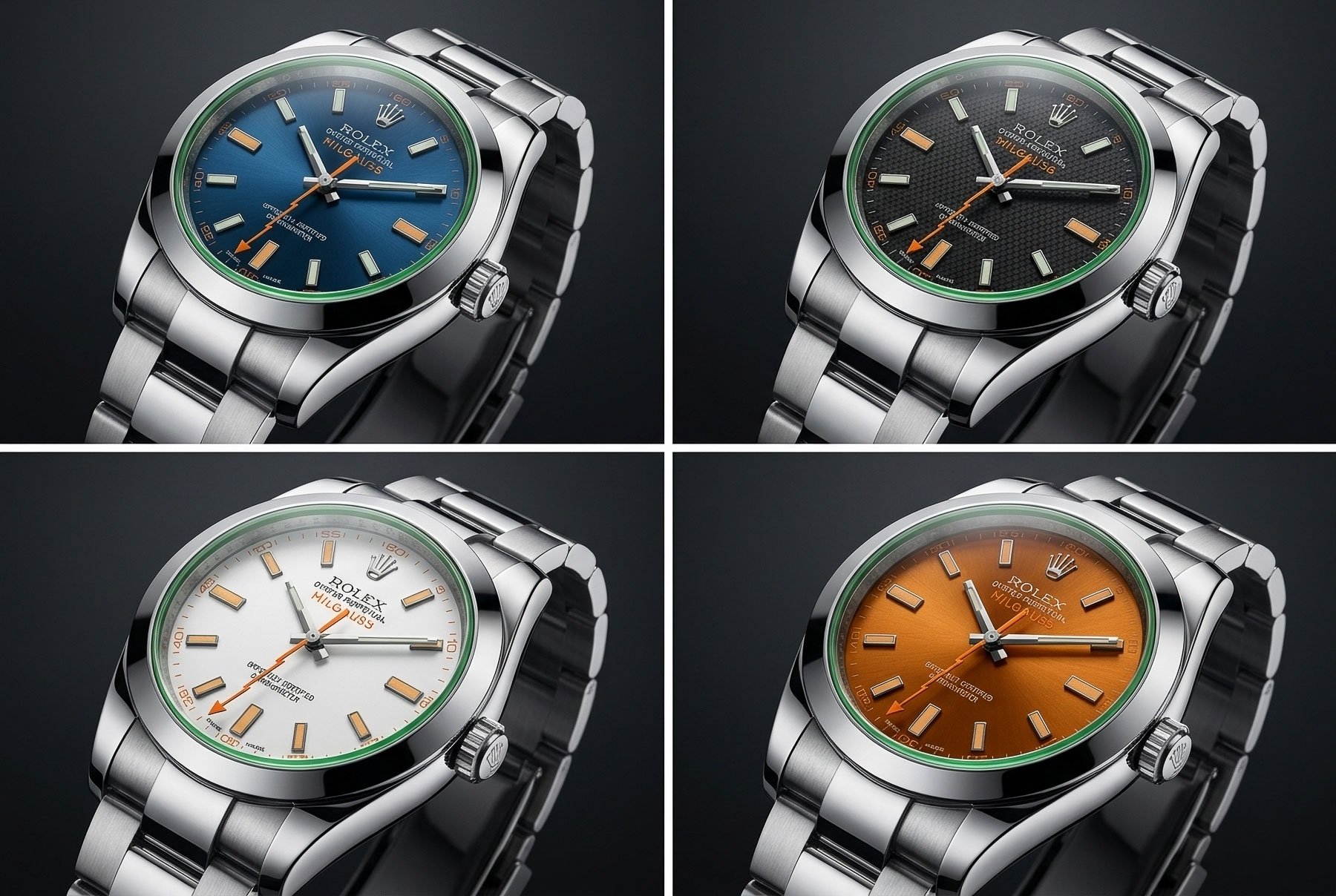 Rolex filed patents for colored sapphire, as previously seen on the Glace Verte (Green Glass) versions of the Milgauss. The patent isn’t limited to green, however, so we might see new colors. We rendered several dial colors to get a feel for what we might get.