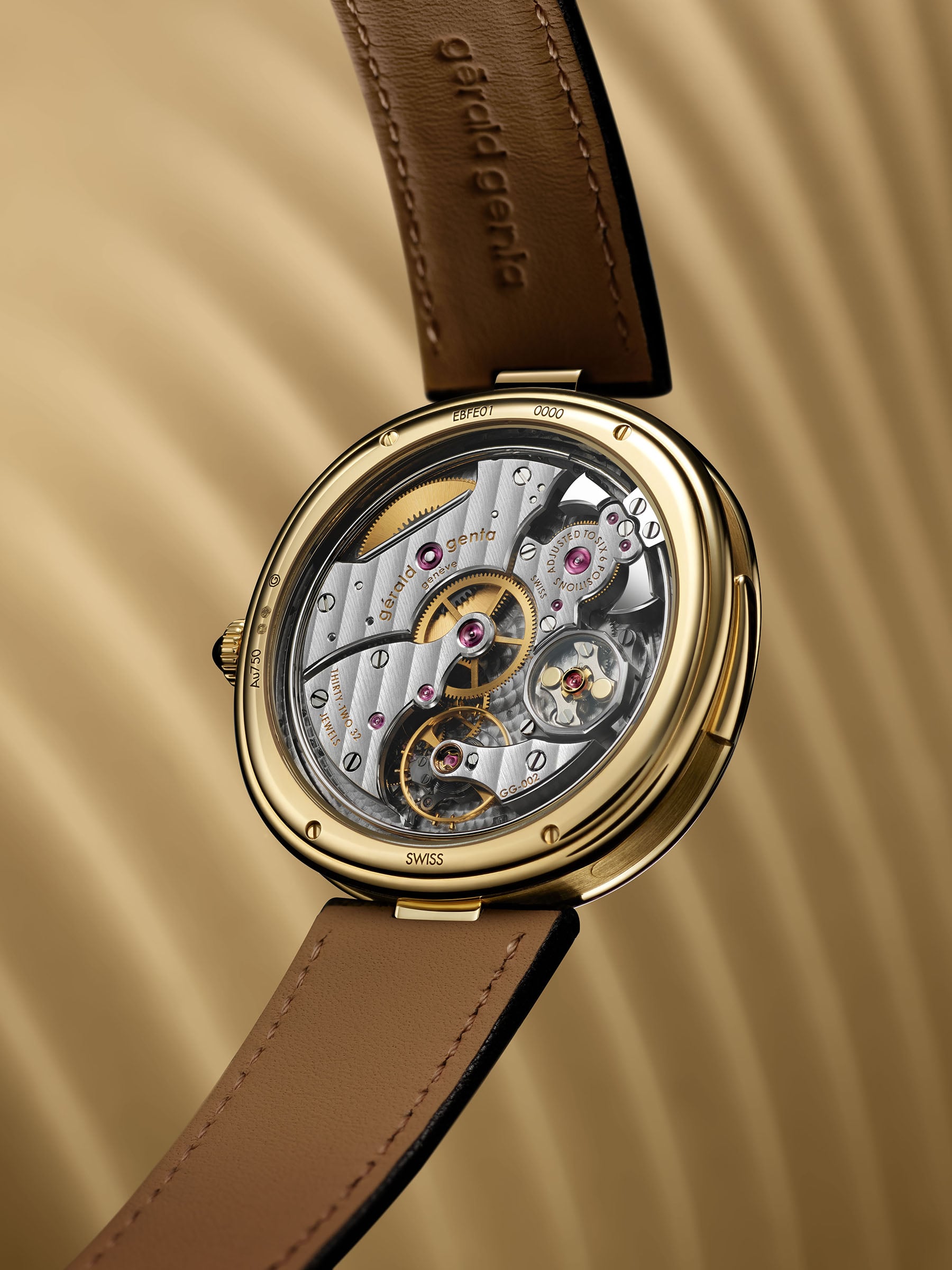 Inside the case, you will find the GG-002 caliber. This movement takes a total of four weeks to produce due to its complex architecture and the 100% manually applied high-horology finishing. The in-house-developed caliber operates at 21,600 vibrations per hour and offers an 80-hour power reserve. A nice detail is the octagonal inertia wheel, a nod to Gérald Genta’s favorite shape. Because it takes a month to produce each movement, production is capped at 10 per year.