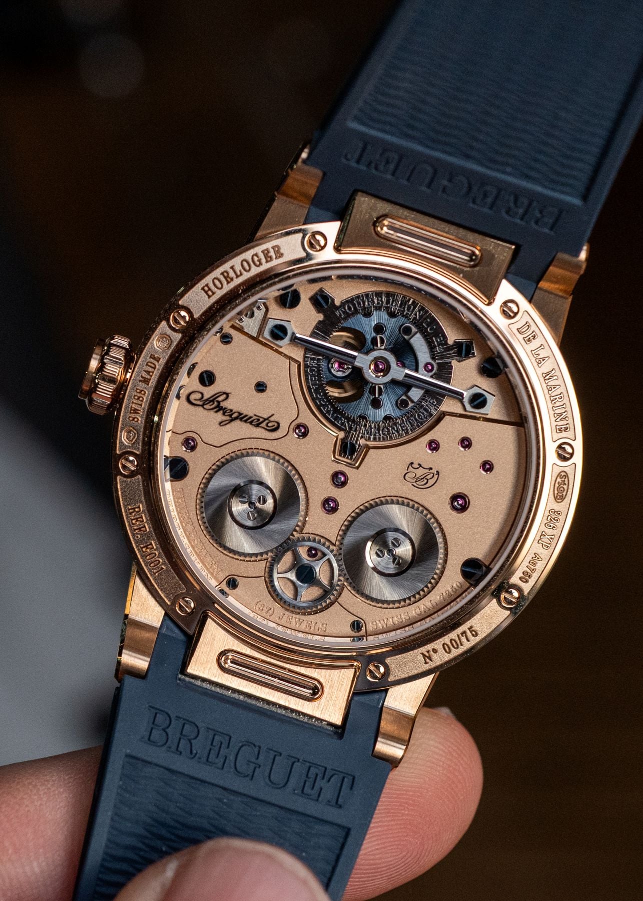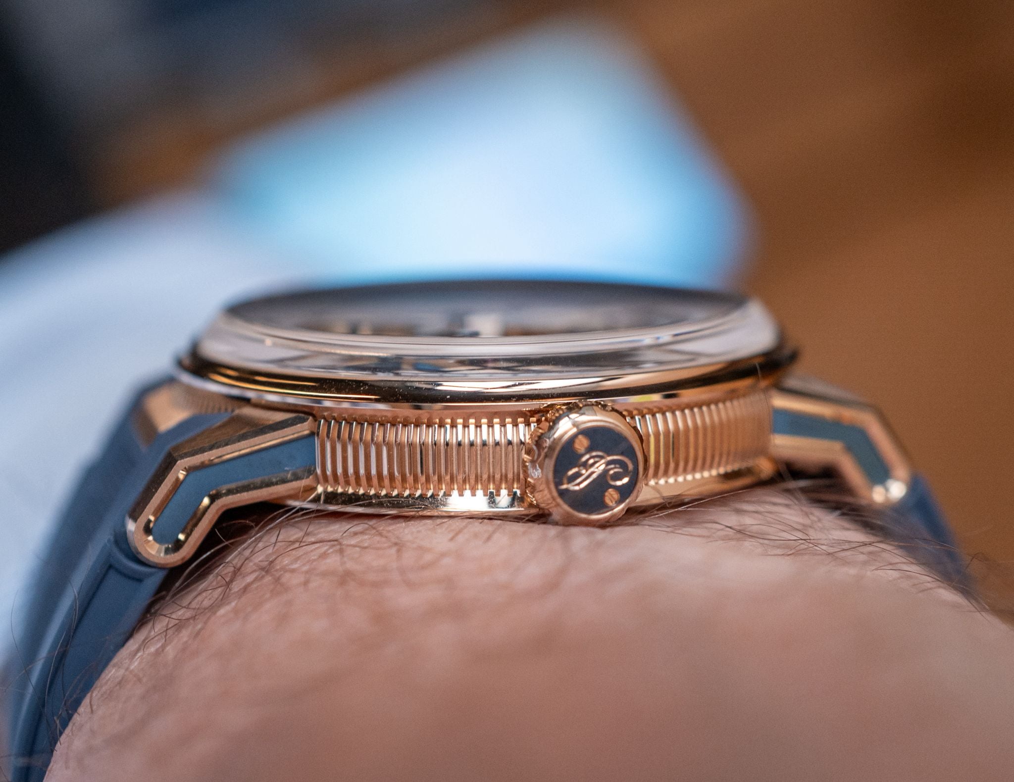 As Lex explained, the watch has a newly designed 43.5mm Breguet gold Marine case. It features an updated design with characteristic coin-edge case sides, closely set central lugs, an interchangeable rubber strap, and fully luminescent indications. All this is combined with the traditional design language of Breguet’s No. 3448 pocket watch, which is particularly evident in the dial design and the caliber’s architecture. As a result, the watch immediately stands out as a fresh and special creation.