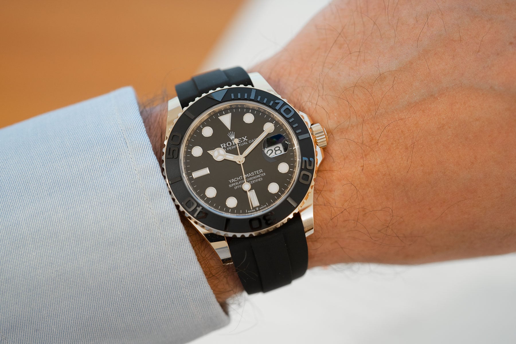 If you want a watch that has a bit of that popular stealth-wealth appeal, how about the white gold Rolex Yacht-Master ref. 226659 on an Oysterflex bracelet? The Yacht-Master models on the Oysterflex bracelets are some of my Rolex favorites. They combine a precious metal case with black rubber for a great look. Next to the 40mm rose gold version and the newly introduced 42mm yellow gold model, this 42mm white gold variant is perfect proof of the brilliant aesthetic.
