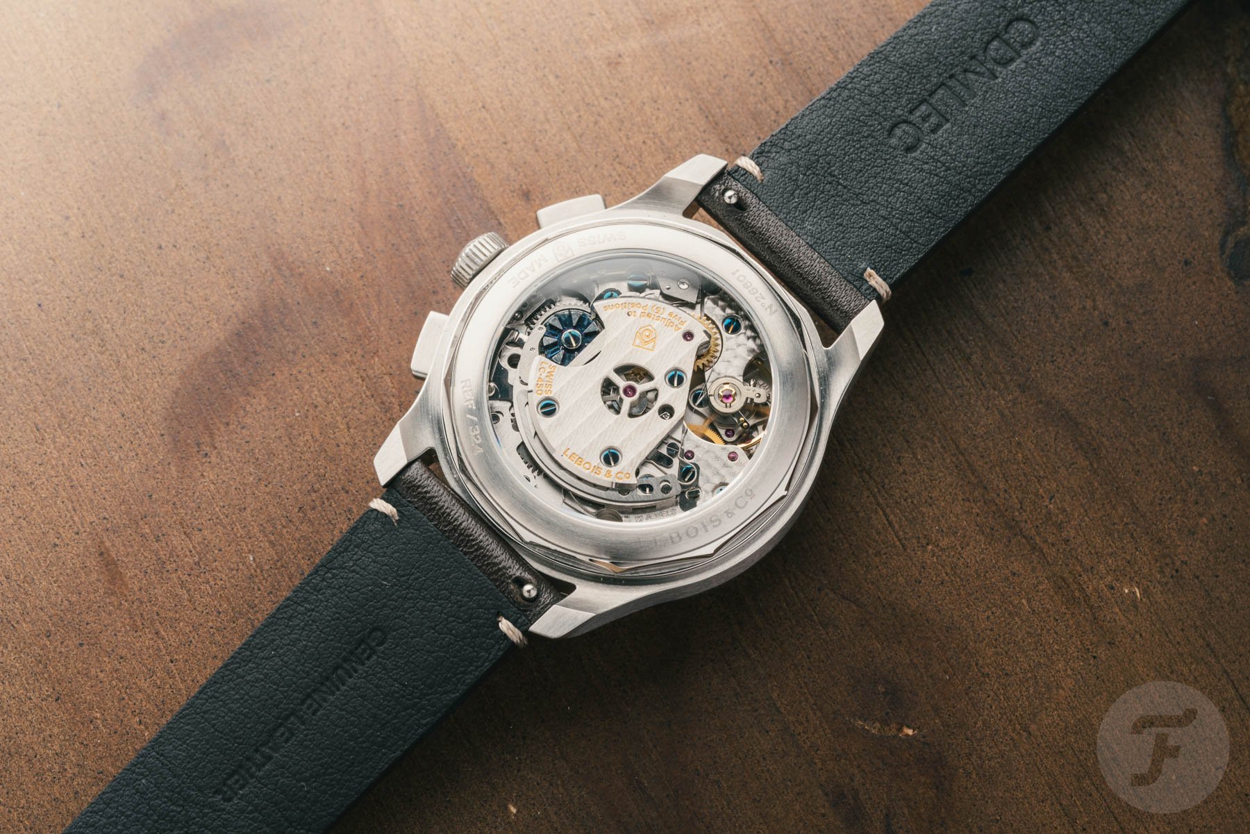 Lebois & Co’s LC-450 chronograph caliber powers the watch. This La Joux-Perret-based manual-winding movement operates at 28,800 beats per hour and offers a 60-hour power reserve. Not to be outdone by the stunning dial, the caliber features Côtes de Genève and perlage decoration, as well as a blued column wheel and blued screws.