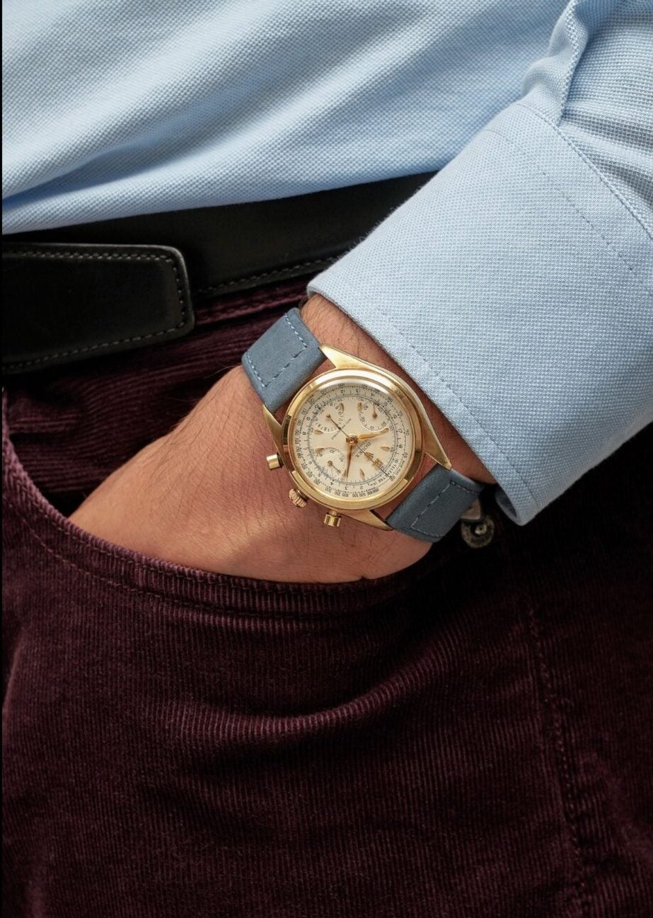 The illustrious Rolex Oyster Chronograph ref. 5034 is an ultra-rare bird. Rolex introduced this reference in 1949, and it was gone from the catalog in 1950. Consequently, it is one of the most sought-after vintage Rolex chronographs. It is usually impossible to find for sale because Rolex only produced 12 yellow gold and 12 pink gold examples.