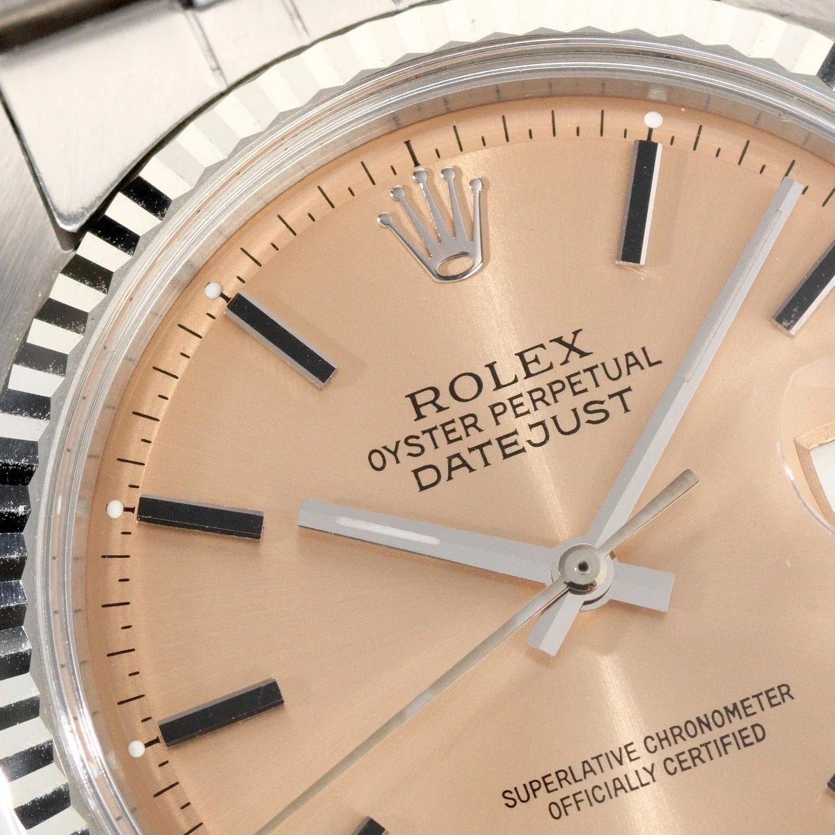 Now we fast-forward to 1959 when Rolex introduced the Datejust ref. 16xx. This series consisted of the ref. 1600 with a smooth bezel, ref. 1601 with a fluted bezel always in precious metal, and ref. 1602 with an engine-turned bezel. A fun fact that Thomas explained in his Datejust Buying Guide article is that the engine-turned-bezel actually was produced in gold as well as steel. However, the overwhelming majority of ref. 1602 watches had a steel bezel. All three references featured a pie-pan dial with a lowered minute track.
