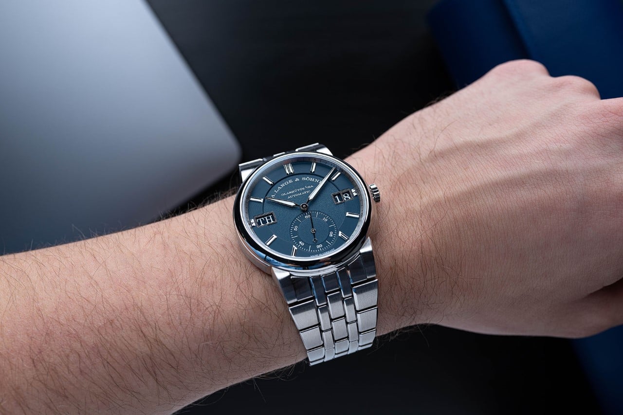 The Odysseus features a 40.5mm case with an 11.1mm profile and a 47mm lug-to-lug. Inside it lies a beautiful dial with a day aperture at 9 o’clock and an “outsize date,” as Lange calls it, at 3 o’clock.