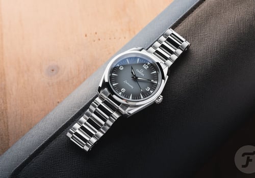 Both watches have a 38mm stainless steel case with a 12.36mm thickness and 45mm lug-to-lug. This is the same case that the brand also uses for the 38mm Aqua Terra. With its relatively short lugs, the Railmaster has a modest presence and wears really nicely. Adding to the great wearing experience is the super comfortable three-row bracelet with slightly rounded links and polished and brushed surfaces. The Railmaster we picked features a gray gradient dial with luminous triangular hour markers, plus Arabic numerals at 3, 6, 9, and 12 o’clock. Finishing the look is the classically styled handset that suits the dial design nicely.