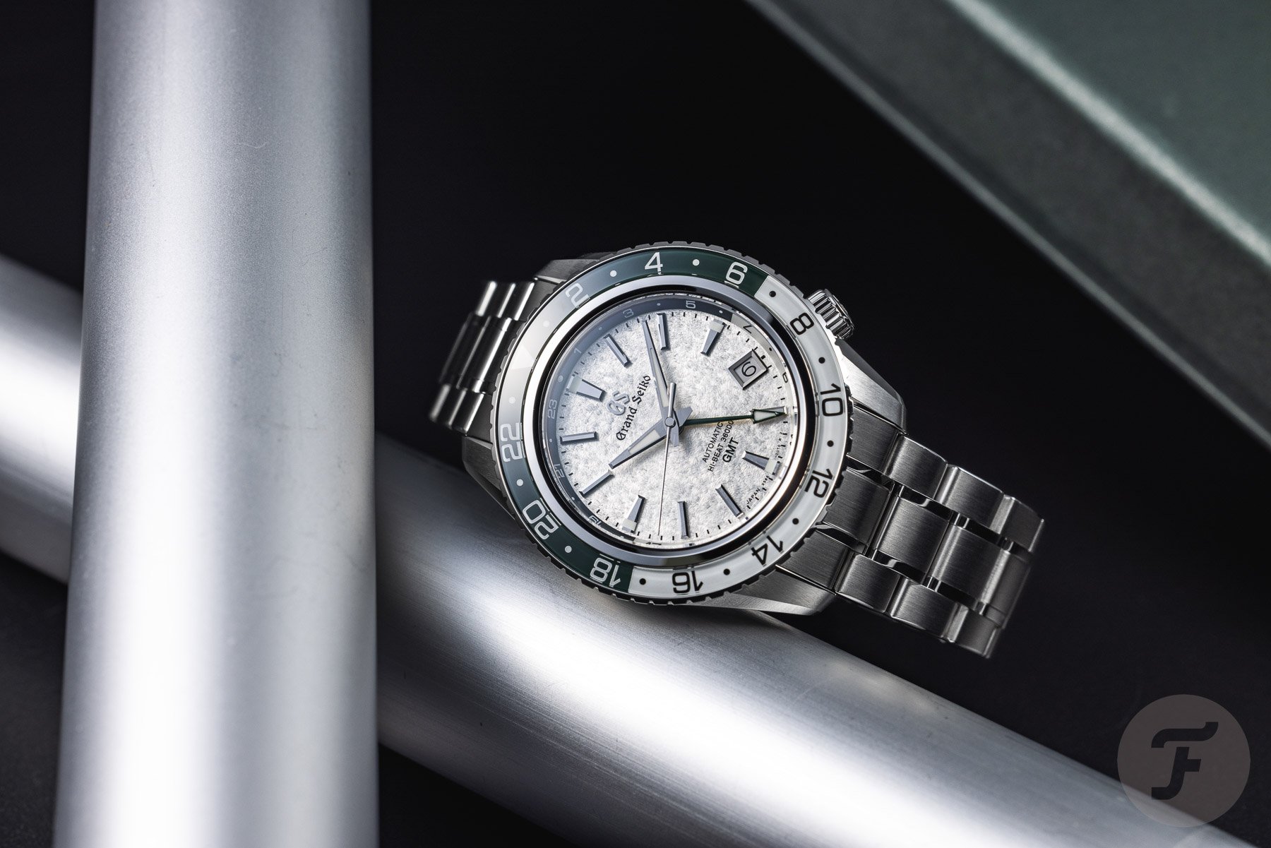 Inside the case, you will find Grand Seiko’s Hi-Beat caliber 9S86. It’s a flyer-style GMT movement running at 36,000 vibrations per hour and offering 55 hours of power reserve. Additionally, the movement has an accuracy of +5/-3 seconds per day. As you can see, the date is located at 4 o’clock and aligns with the crown that controls the caliber.