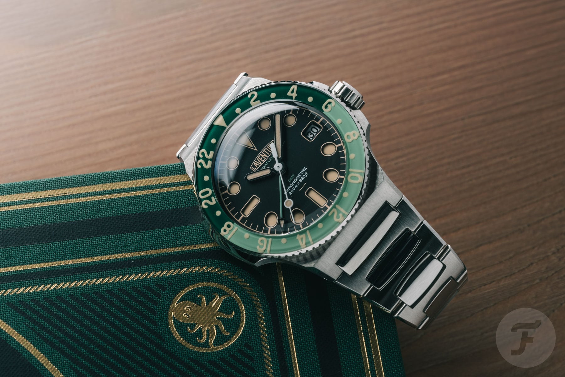 But what I find most charming is the choice of colors, combined with the dial and bezel styling. The matte black dial features a sandwich construction with beige luminous indexes and a date window at 3 o’clock. Additionally, the 24-click bezel features a forest- and sage-green Plexiglas insert with vintage-style numerals that I adore. It creates a unique look characterized by its incredibly detailed design and great vintage charm. Add the super comfortable stainless steel bracelet that we prefer over the optional rubber strap, and this is a fantastic vintage-styled GMT.