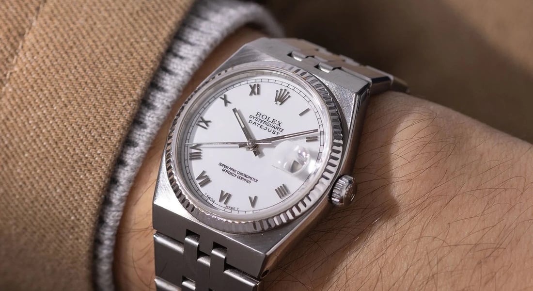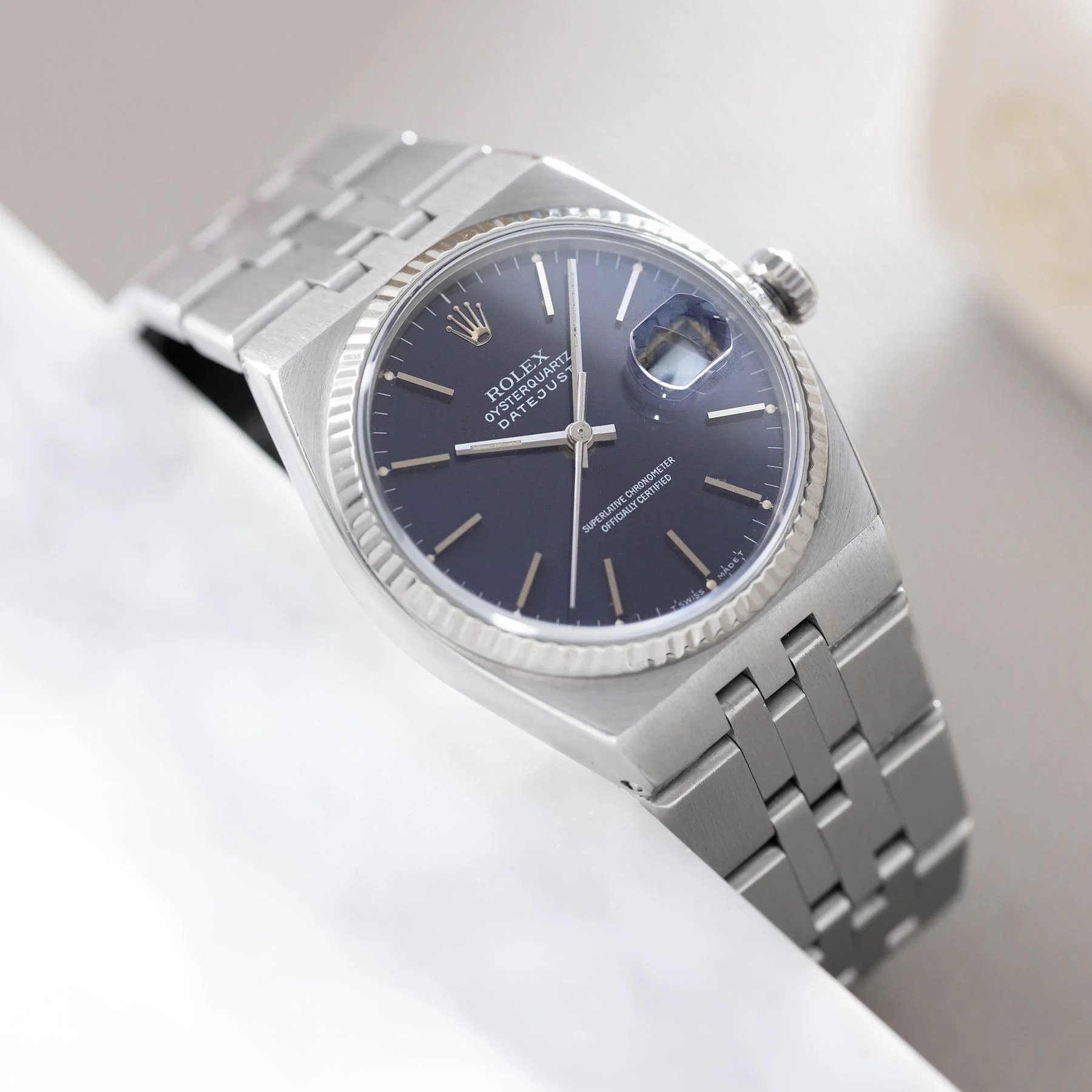 Inside the case, you will find the Rolex caliber 5035, a COSC-certified chronometer. It’s an exceptional quartz caliber that was built like a mechanical one. Additionally, thermocompensation and antimagnetic hardening helped ensure the movement’s precision. As some of you know, the requirements for a COSC-certified quartz caliber are much more stringent than those for mechanical movements. All this makes the Rolex Oysterquartz Datejust ref. 17014 the perfect combination of technological innovation and classic looks. Expect prices to start at roughly €6k and move up to €12k for a complete set in excellent condition.