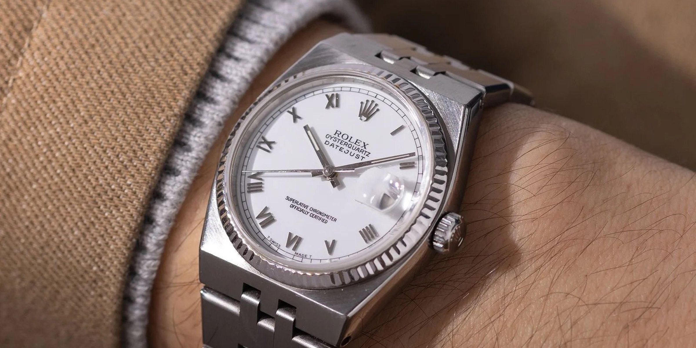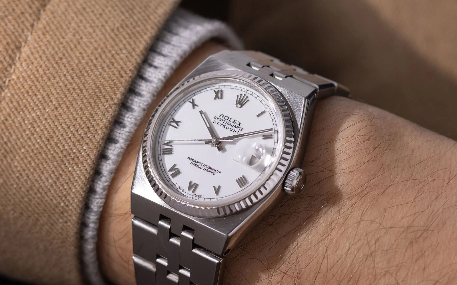 The Oysterquartz came out in 1977 and remained in the brand’s lineup until 2004. However, the stainless steel models disappeared from the catalog in 2002. It is believed that Rolex produced only about 25,000 pieces of the various Oysterquartz references over 25 years. The Oysterquartz Datejust ref. 17014 features a 36mm case and a steel five-row bracelet that is a joy to wear. However, if you’re buying one, make sure you get a bracelet in good condition because it absolutely worth the extra money for daily comfort and looks.