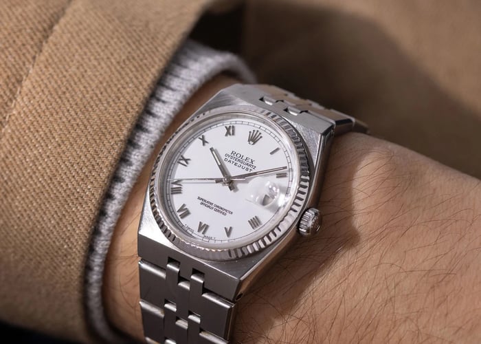 Our first pick is the brilliant Rolex Oyster Perpetual Date ref. 1530. This watch debuted while Rolex was still working on the quartz caliber that would eventually power the Oysterquartz models (more on those soon). Since the case and bracelet were ready for production, Rolex decided to release the excellent Oyster Perpetual Date ref. 1530. The watch was produced from 1975 to 1977. Supposedly, Rolex only made 1,500 examples of this reference during that time.