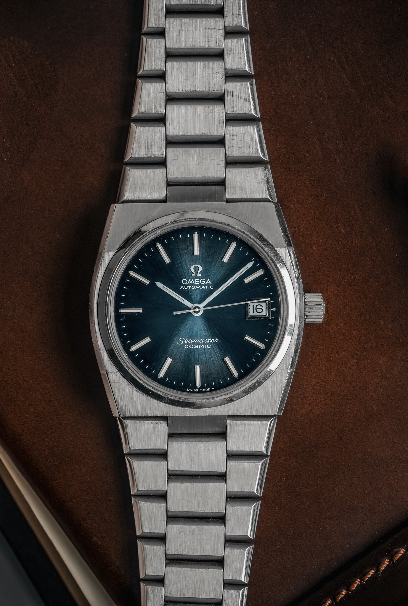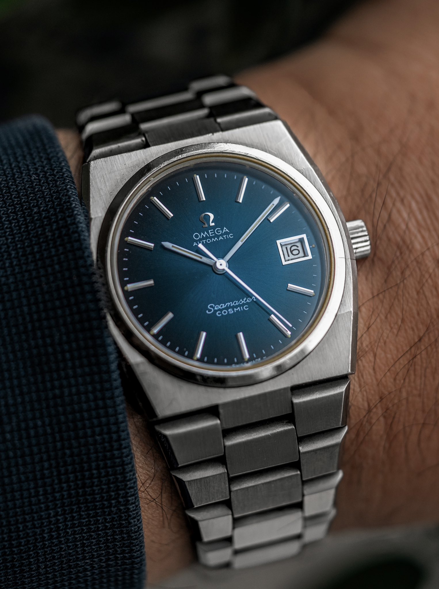 Inside the case, Omega used its caliber 1012. This automatic movement operated at 28,800vph, had 23 jewels, and offered 42 hours of power reserve. While the case and the bracelet are substantial in appearance, Omega’s caliber 1012 is one of the brand’s thinner movements, with a 4.25mm profile. Regarding the dial, Omega offered this Seamaster Cosmic with gray or blue vignette dials, both of which look awesome. The blue dial often has a rich, dark hue, and thanks to the patina that has formed over the years, it has become even more lively and colorful than it was originally.