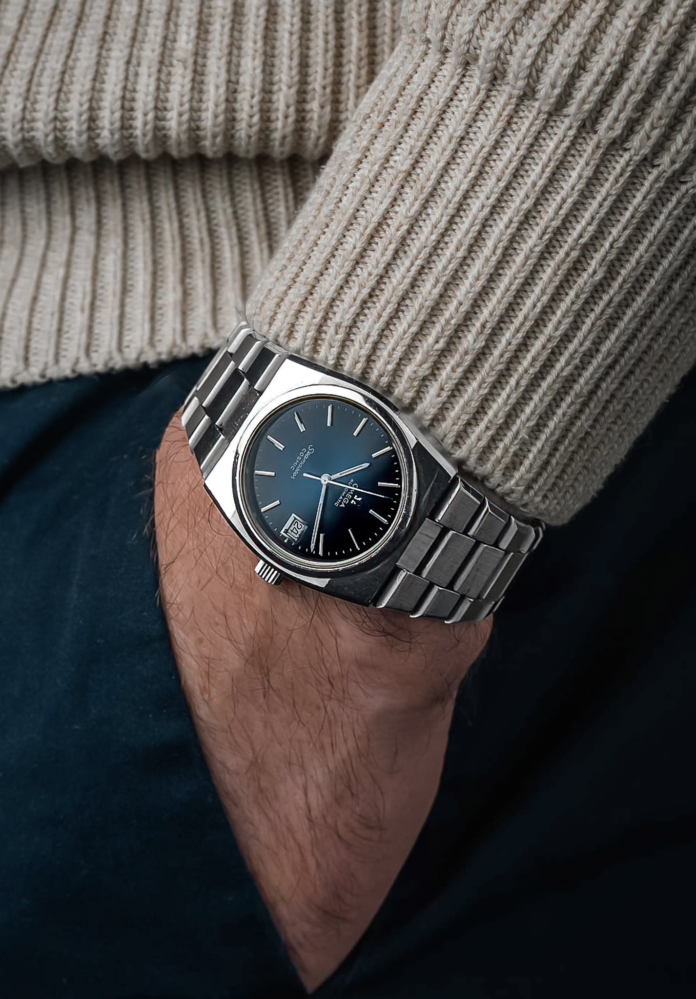 Our next pick is the often-overlooked Omega Seamaster Cosmic ref. 166.1095. As you can see, it mirrors the classic Rolex Oysterquartz models’ aesthetic. Omega produced this reference in the mid-1970s, and it’s sometimes referred to as the Cosmic 2000 because some of the dials had “2000” under the “Cosmic” designation. The watch had a 36mm angular case matched with a comfortable yet blocky integrated bracelet. The overall presence flawlessly fits the time period.