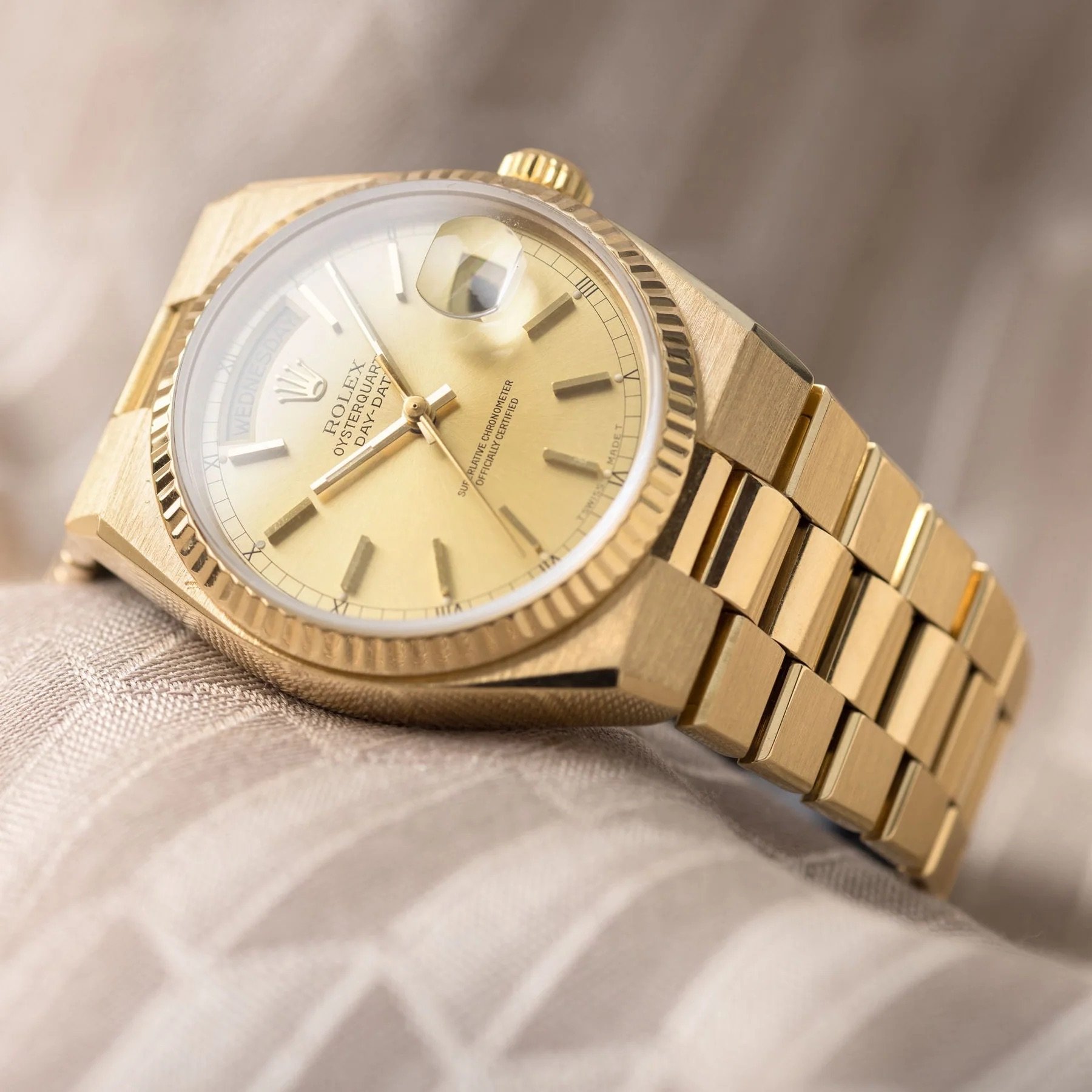 While that last one is already a considerable step up in extravagance, Rolex also produced several Oysterquartz Day-Date models with gem-set bezels and bracelets. Those take the bling factor up a few notches, but let’s focus on the “basic” ref. 19018 for this article. The watch also utilized the angular 36mm Oysterquartz case but featured a modern, angular take on the President bracelet that beautifully suited the case’s design.