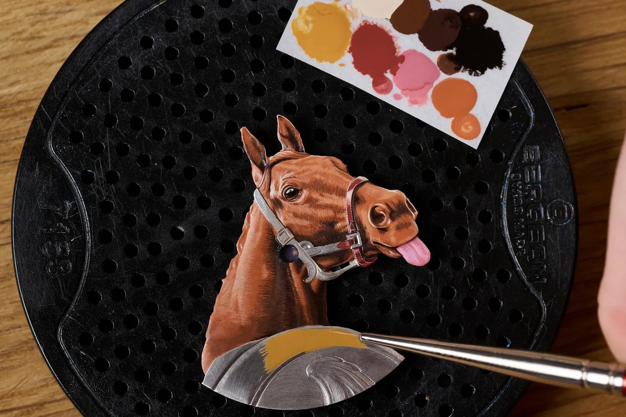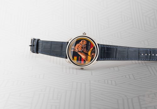 Not only is it brilliantly fun, but it’s also a proper technical tour de force. It all starts with a 41mm white gold or rose gold Arceau case with its round shape and signature lugs. This case houses the colorful and whimsical dial. The horse on it was modeled after Dimitri Rybaltchenko’s Rocabar de Rire striped scarf. The scarf was introduced in 2023 and is made of a mix of cashmere and silk in different color combinations, as Daan explained. On the scarf, you will find the brown horse that sticks its tongue out while looking over its shoulder.